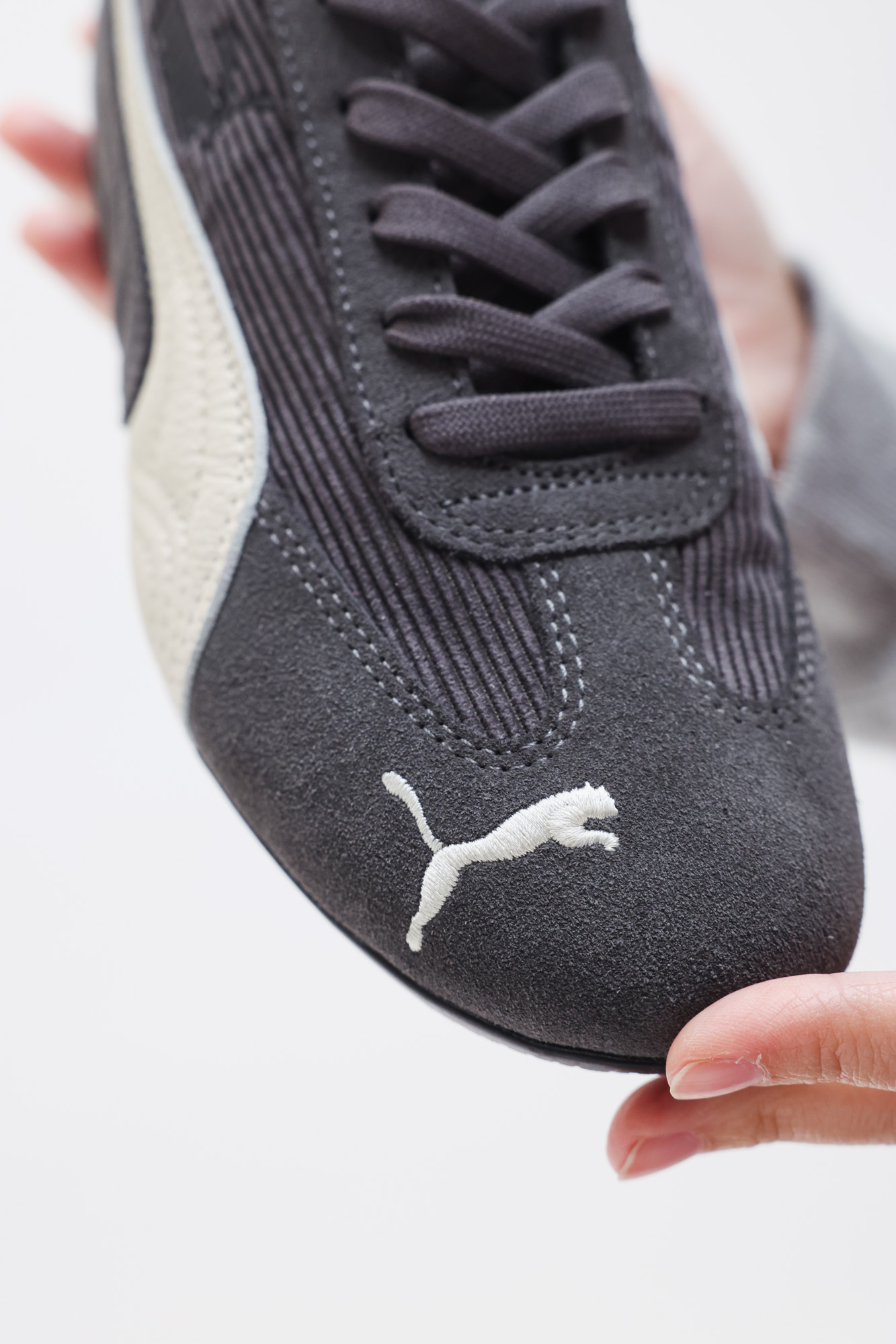 沒錯,這兩種材質是優雅的,讓 SPEEDCAT 不再只連結到賽車、或者常出現在潮流街拍的鞋款,而是能搭配正裝,上班跑趴都適合的一雙鞋。想要低調些,或者你是上班族,可以選擇奢絨灰,日常逛街 party,奢絨紅則是絕對亮眼,卻不會過於搶鏡的存在。