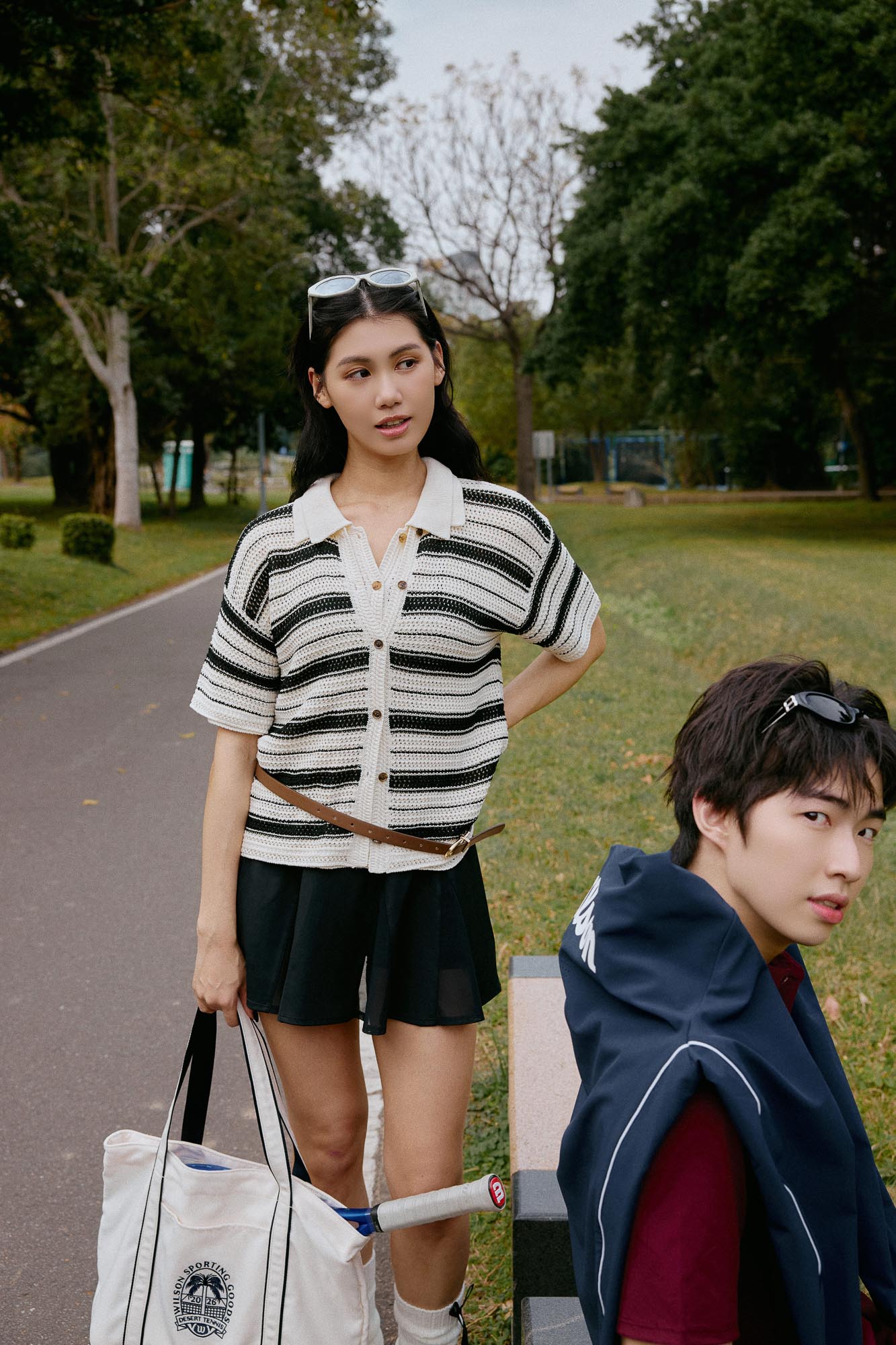 想要更有層次?試試針織衫疊穿!內白外條紋的重疊領口,配上黑色網球裙和現在最流行的「泡泡襪 + 芭蕾運動鞋」。這套不僅能打球,直接去野餐或逛街也完全是街頭焦點。