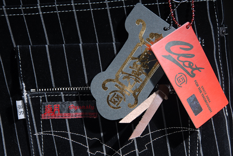 CLOT DYNASTY 是由 CLOT 所推出的服飾系列,這次結合了街頭流行元素加上 The Man is in the Forest 主題推出單品,本文介紹的單品就是以愛麗絲夢遊仙境裡個性鮮明的『瘋狂帽客』為設計靈感推出了 Mad Hatter Flocky Stripe Denim,以特殊的絨布製作並印上灰色條紋,徹底顛覆了一般人對於牛仔褲的預設概念。