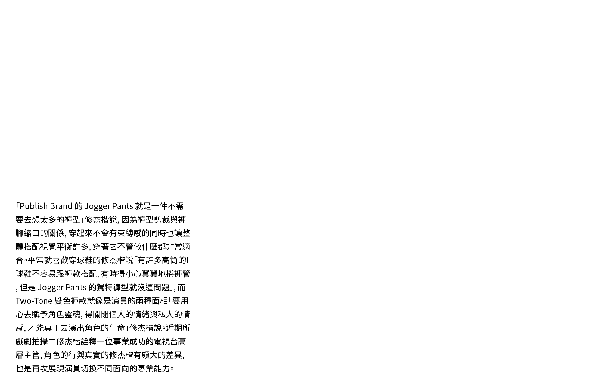 「PUBLISH BRAND 的 Jogger Pants 就是一件不需要去想太多的褲型」修杰楷說, 因為褲型剪裁與褲腳縮口的關係, 穿起來不會有束縛感的同時也讓整體搭配視覺平衡許多, 穿著它不管做什麼都非常適合。平常喜歡穿球鞋的修杰楷說「因為球鞋有許多高筒的鞋款所以許多褲款搭起來都不太合適, 甚至需要捲起褲管才能達到視覺平衡」, 但是 Jogger Pants 的獨特褲型就不會有這個問題, 而拍攝所穿著的 Two-Tone 褲款就像是演員的擁有兩種面向般「要用另一個生命去賦予角色, 必須關閉個人的情緒與私人的情感, 才能真正去體驗角色的生命」修杰楷說。而近期剛忙戲劇的拍攝, 在戲中修杰楷詮釋一位事業成功的電視台高層主管, 角色的行為舉止緩慢而有條理, 與真實的修杰楷有著頗大的差異, 這也是身為演員能切換兩種面向的專業能力。