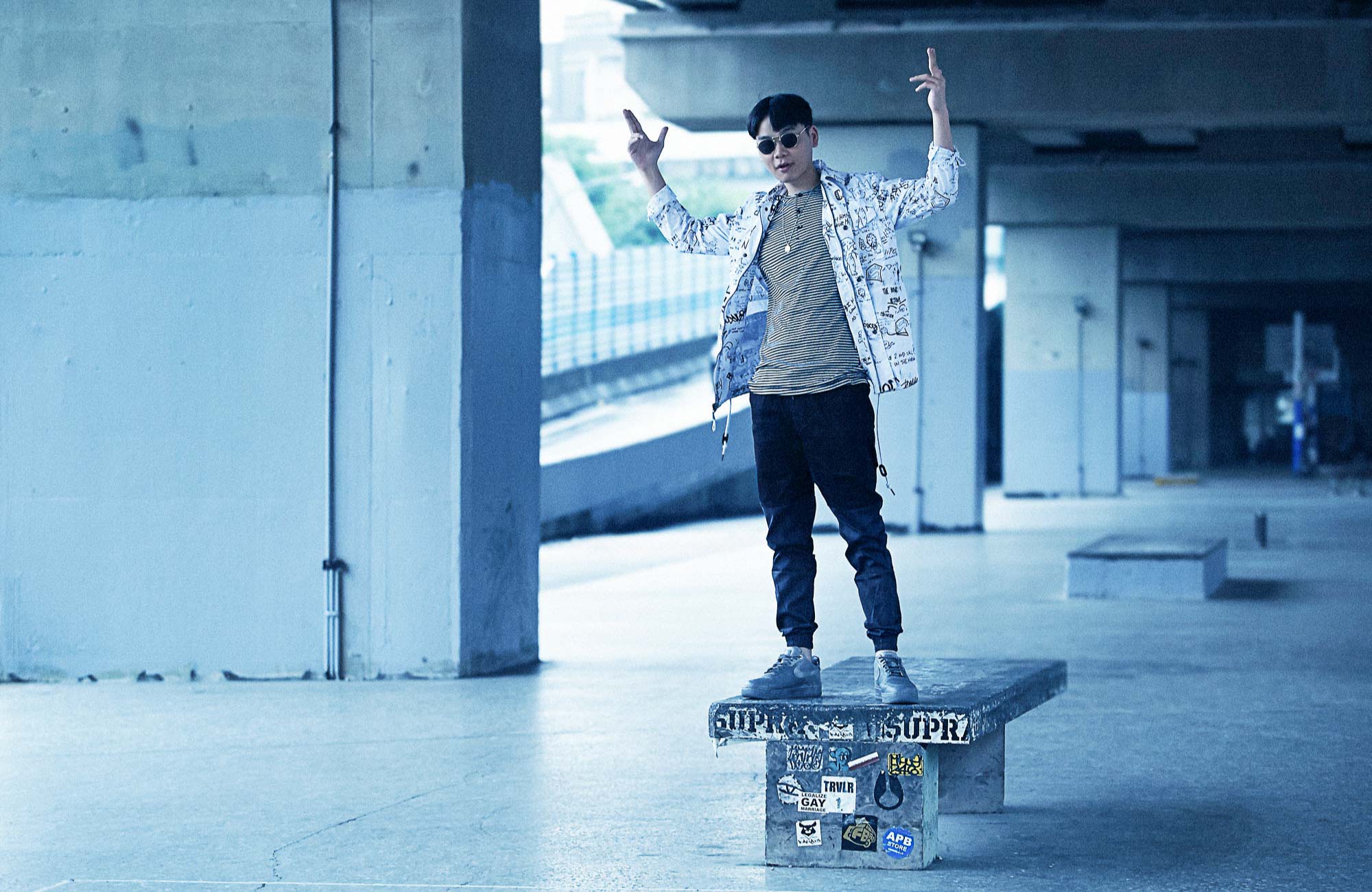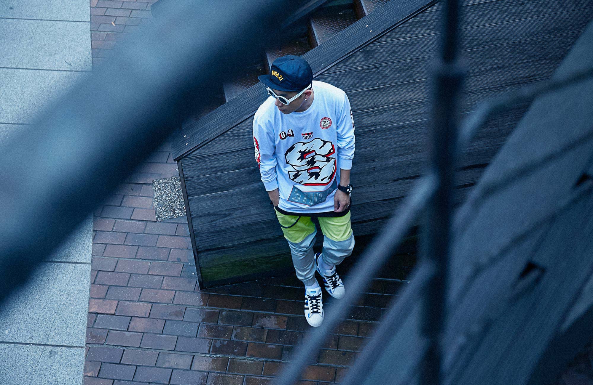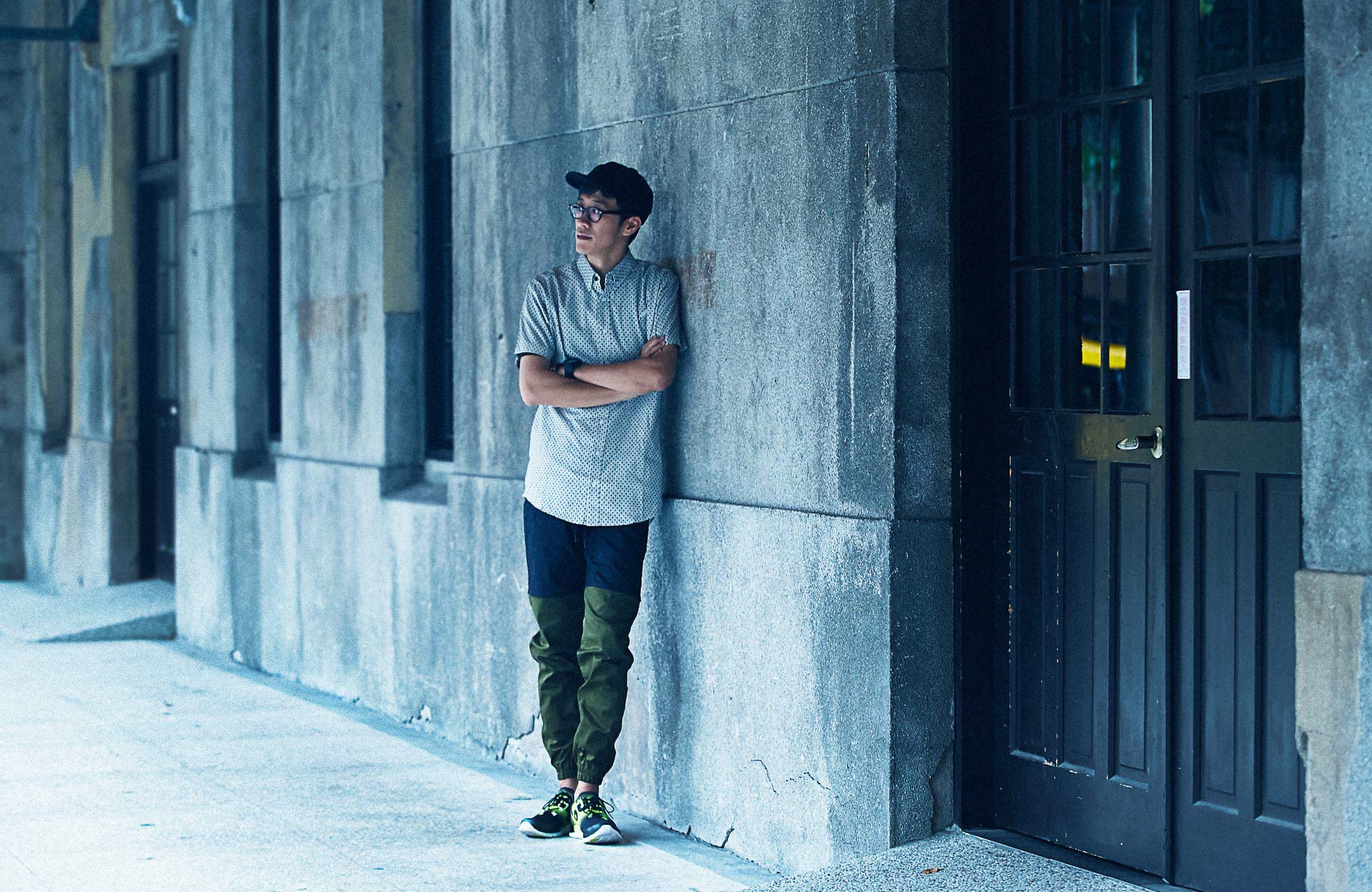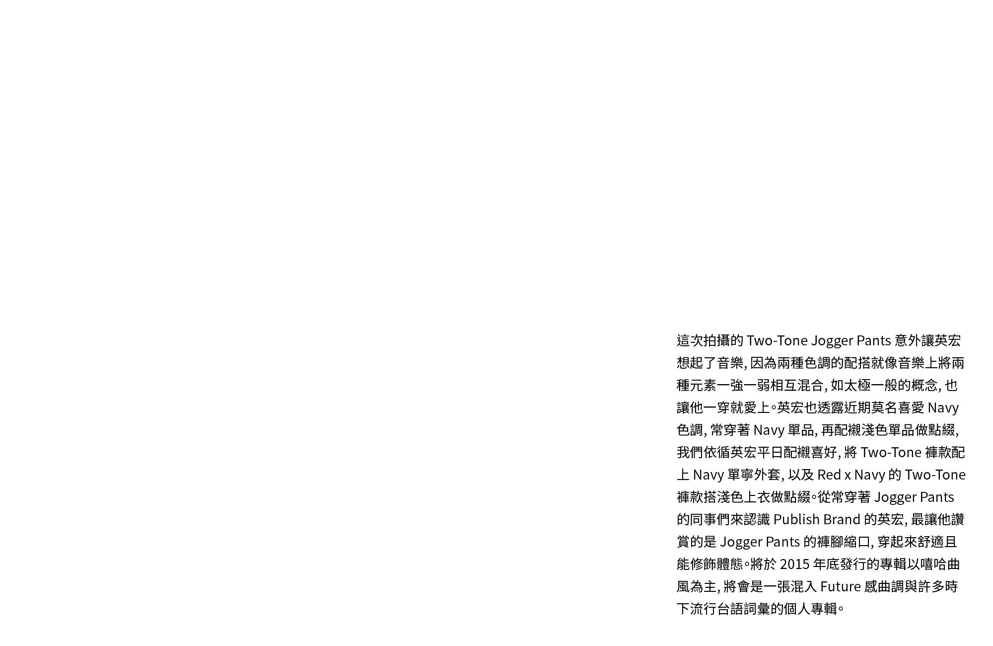 這次拍攝的 Two-Tone Jogger Pants 意外讓英宏想起了音樂, 因為兩種色調的配搭就像音樂上將兩種元素一強一弱相互混合, 如太極一般的概念, 也讓他一穿就愛上。英宏也透露近期莫名喜愛 Navy 色調, 常穿著 Navy 單品, 再配襯淺色單品做點綴, 我們依循英宏平日配襯喜好, 將 Two-Tone 褲款配上 Navy 單寧外套, 以及 Red x Navy 的 Two-Tone 褲款搭淺色上衣做點綴。從常穿著 Jogger Pants 的同事們來認識 Publish Brand 的英宏, 最讓他讚賞的是 Jogger Pants 的褲腳縮口, 穿起來舒適且能修飾體態。隸屬於顏社的嘻哈歌手英宏, 英文 Didilong 是個幽默的雙關語, 意思來自於台語的「直直撞」, 英宏將於 2015 年底發行以嘻哈曲風為主, 將會是一張混入 Future 感曲調與許多時下流行台語詞彙的個人專輯。