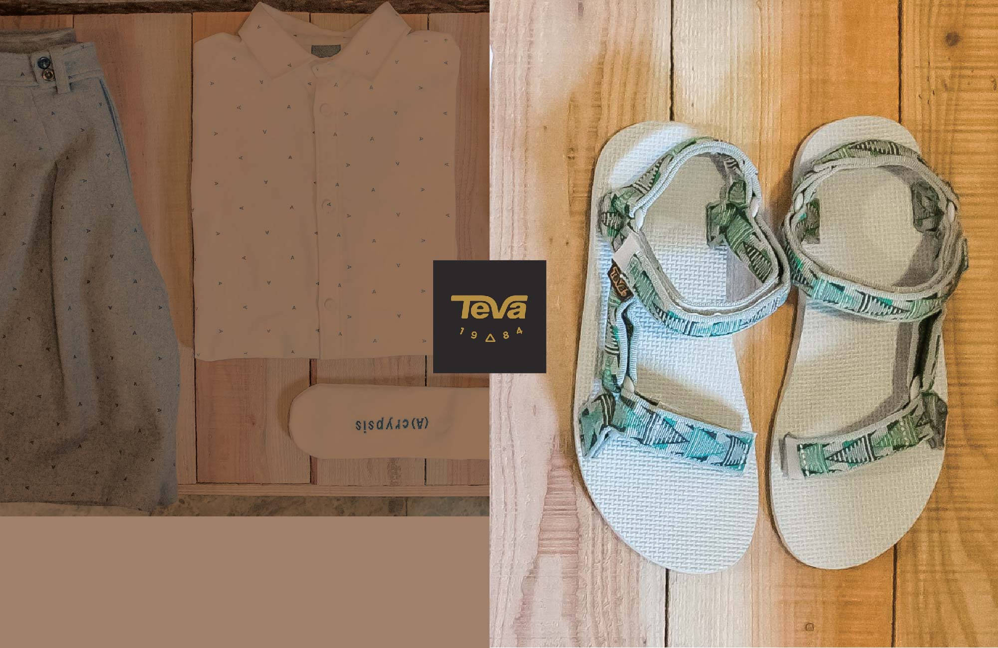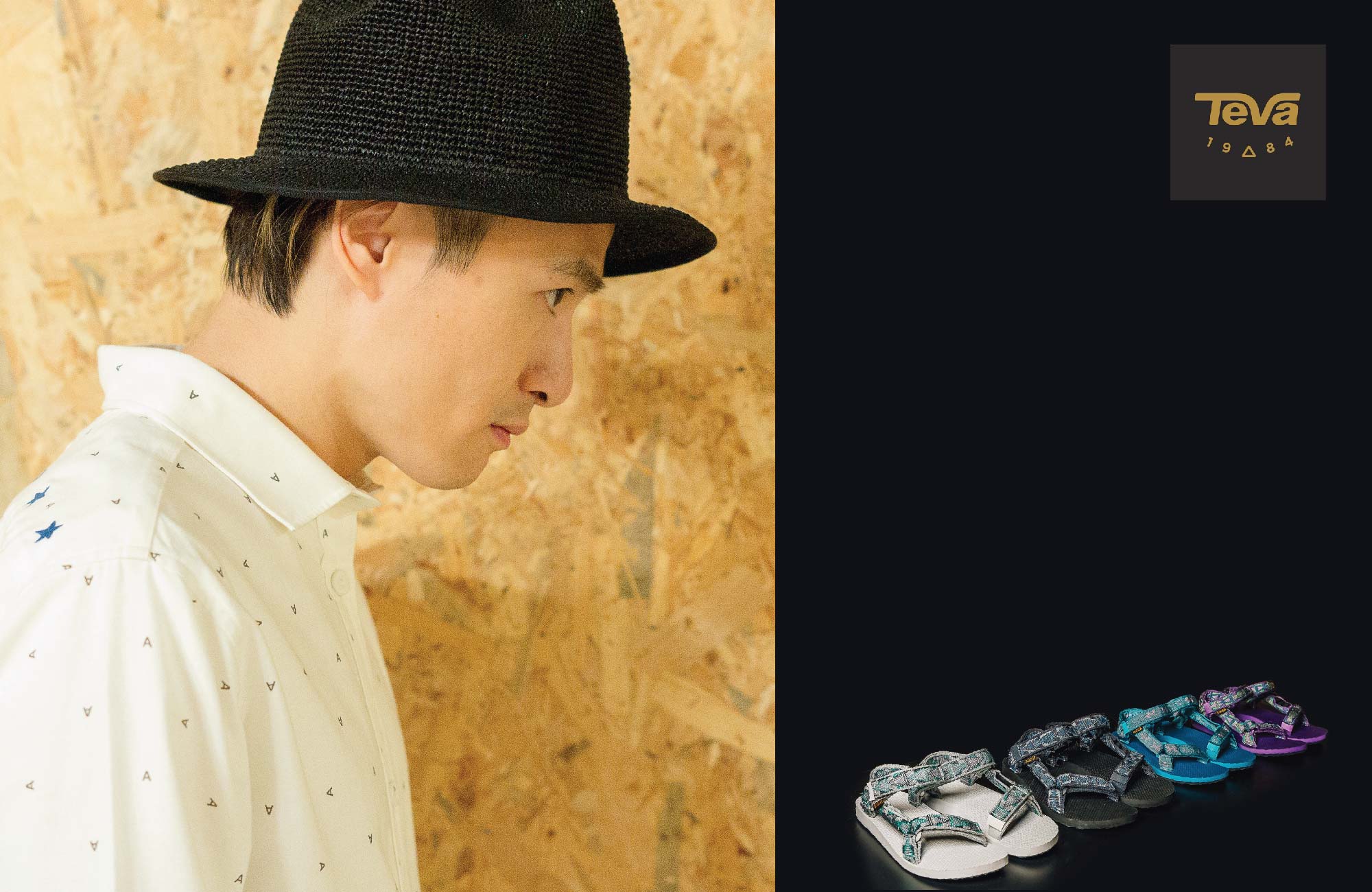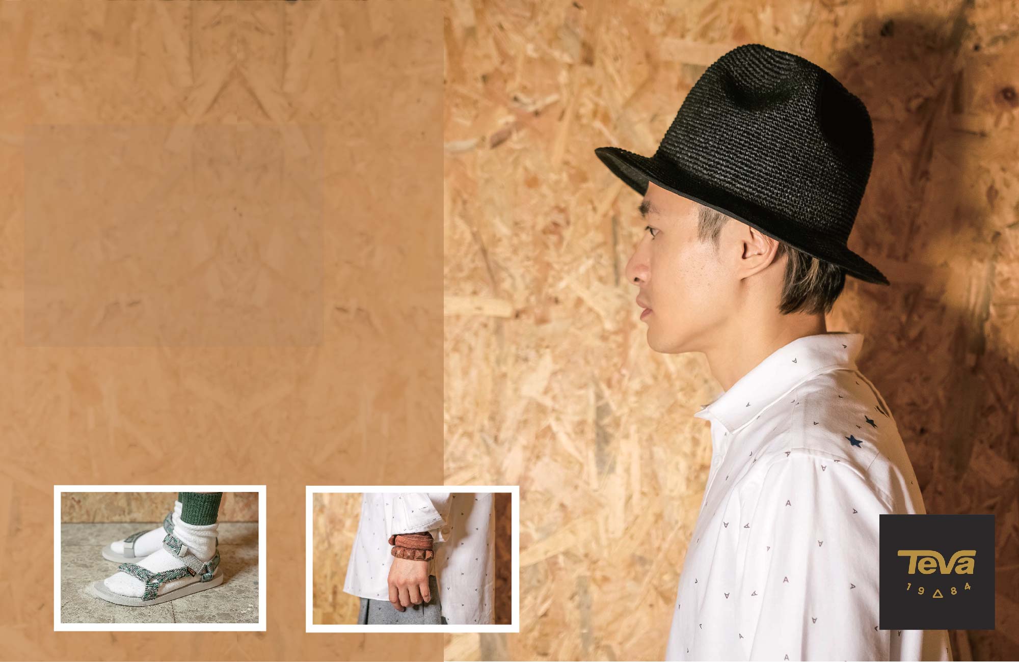 男性在造型上層次感並不是只有靠一件又一件的上身單品覆蓋堆疊才能達成,善用不同的配件就是 A-HOM 個人特色手法,本回便以黑色編織紳士帽、仿木紋手環,以及「前短後長」的白色長版襯衫進行混搭,不論是在色彩明亮度、版型剪裁變化上都共同構築出出鮮明的層次效果,再加上細節的圖樣選擇,與 Teva 共同解決這場夏日造型習題。