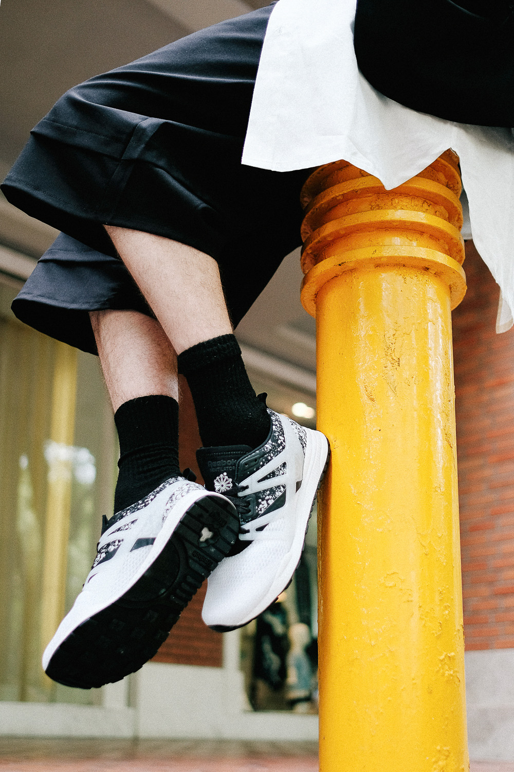 寬短褲非常適合在這季節替換之際穿用,上身則用特別剪裁長上衣與長襯衫做出層次造型,再以俐落的西裝外套使造型昇華,REEBOK VENTILATOR ADAPT GRAPHIC 的潑墨漸層與黑白分明的配色完整了層次搭配。