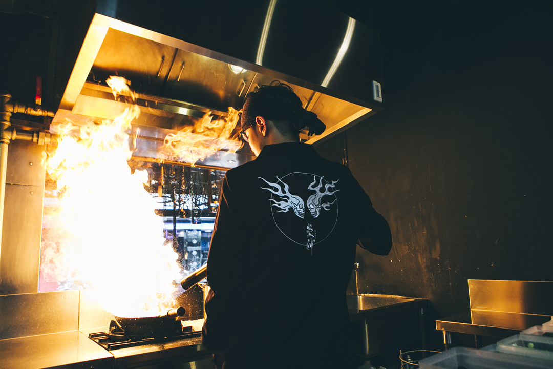 跨界話題 / OVKLAB × 札幌炎神拉麵 炙焰聯名企劃 在炎神拉麵的制服設計上,OVKLAB 選用了易於工作穿著的 T-shirt 與工作襯衫二種款式,來呈現炎神拉麵的專業精神,並且以雙方品牌的代表色 – 黑色,作為主要使用的色彩。T-shirt Next