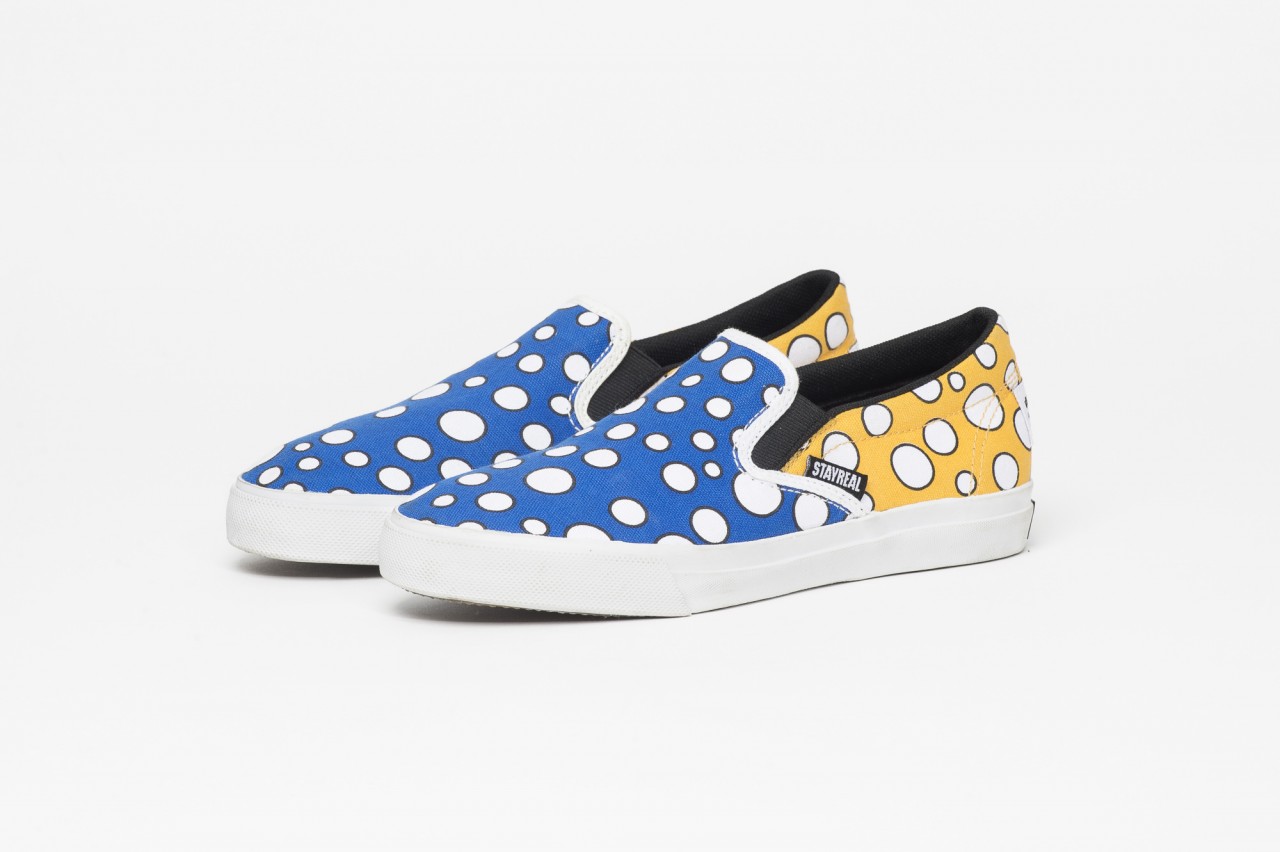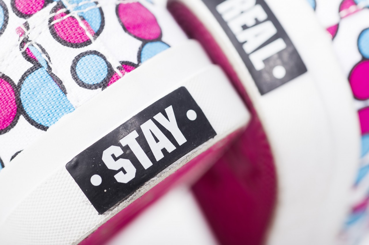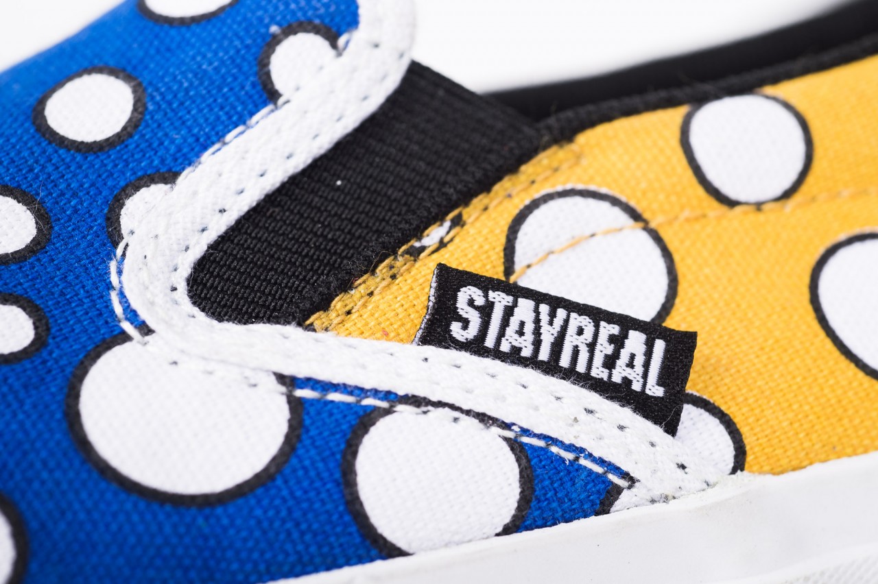 STAYREAL 經典的 ALL IN ONE 設計,除了原本的鞋帶外,更加入活動式綁帶及拉鍊,創造出三種不同鞋身樣貌,將雙色的波點不規則重疊,創造出更豐富多變的視覺感;另一款則是佈滿 STAYREAL 的英文字母,展現品牌與藝術家交彙充滿活力的精神。