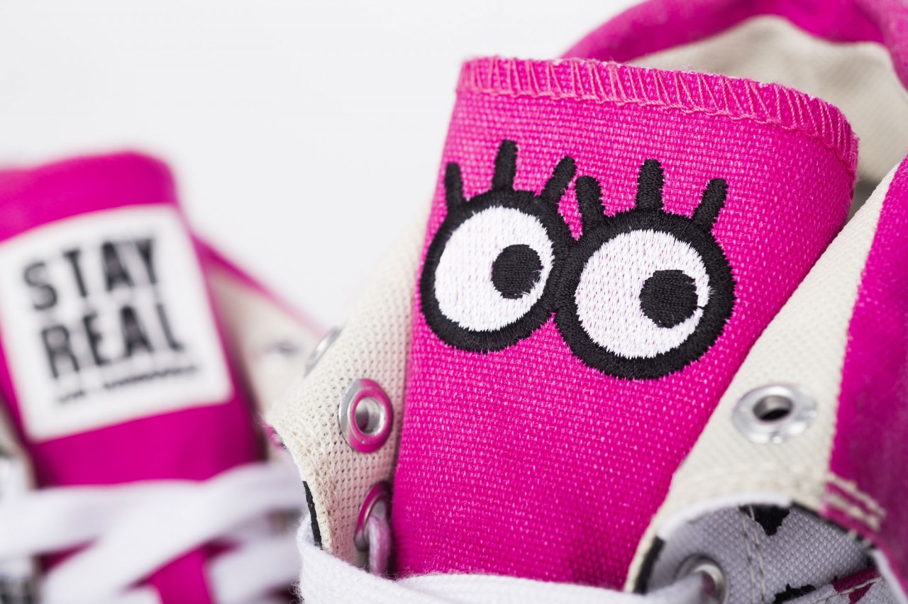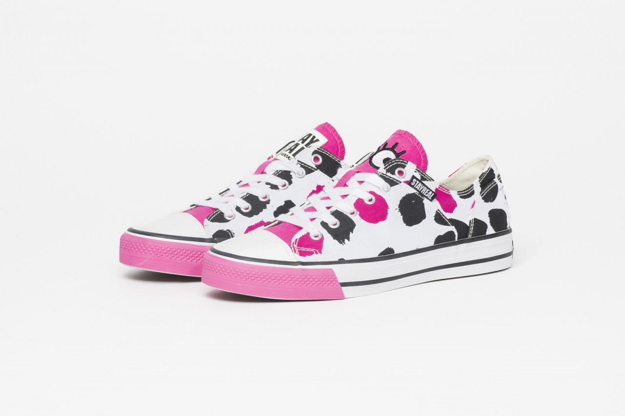 利用筆刷方式將飽和的黑色與桃紅色隨興交錯,呈現獨特的豹紋波點圖騰。雙腳不同步的鞋舌設計,結合 STAYREAL 品牌元素與 Jun Watanabe 搞怪形象,搭配亮色系的服飾亦可讓鞋履著用帶來會心一笑的趣味。