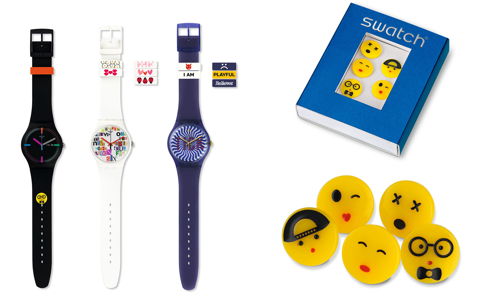 萌味客製 / Swatch Emoji 表情配件限量登台 Swatch 致力關心數位流行文化,觀察到現代年輕人樂於社群媒體分享表達自己的心情,特別在年末之際設計推出限量「Emoji 表情配件組」,混搭稚氣圖案和Emoji Next