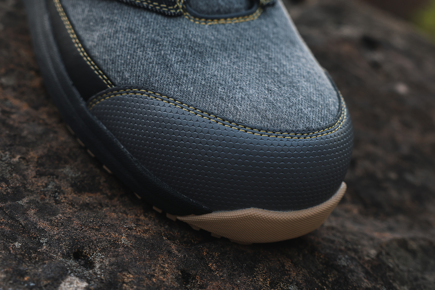 雖然外觀上更貼近日常,但 PRIME FIT LSII 11 DENIM 的本質仍是一雙具備完整防護性能的工作鞋。鞋頭內嵌硬質樹脂護趾片,符合國家 CNS20346 標準,可有效分散外部衝擊力道,當重物或器材不慎掉落時,能第一時間承受壓力,避免腳趾受傷。護趾片形狀經過優化,貼合腳型輪廓,在行走與下蹲時不易卡腳;外層再以耐磨人工皮革加固,提升鞋頭結構的整體強度,也延長使用壽命。這樣的配置符合專業防護等級標準,同時保有穿著時的靈活度。