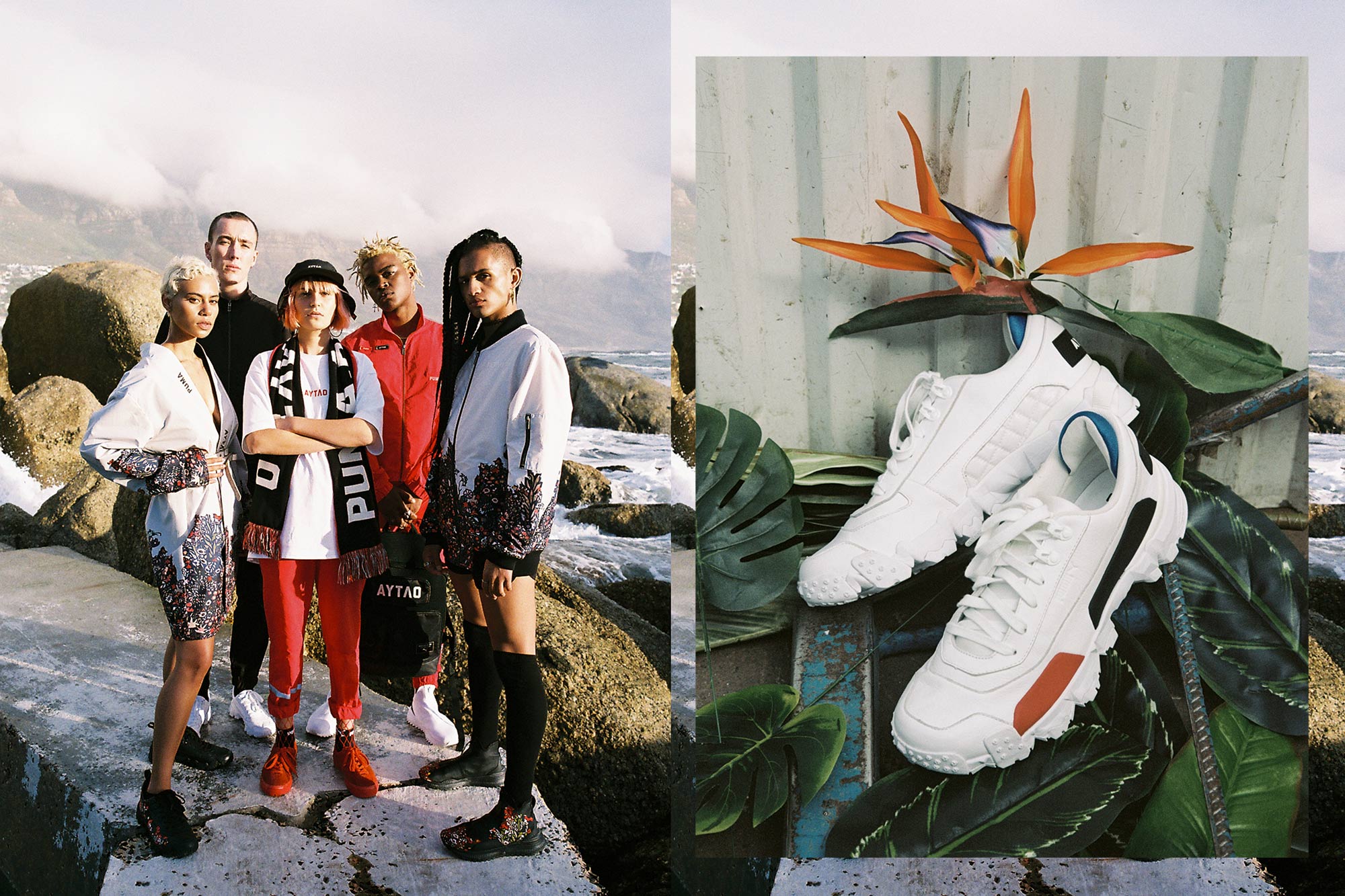 來自俄羅斯莫斯科 OUTLAW Moscow ( 又稱AYTΛ ) 的前衛時尚品牌,2014 年由設計師 Maxim Bashkaev 與 Dilyara Minrakhmanova 創立,大膽又前衛的風格,多次在巴黎與米蘭時尚週展露頭角。本次 PUMA SELECT 發佈與 OUTLAW 最新聯名系列,以黑、白、紅三色為主軸,以俄羅斯傳統花卉為主題,加入斯拉夫文字等傳統圖騰,特別以斯拉夫文字 ПYMA 代替英文 PUMA 字樣,加上 Made in Russia 的斯拉夫文字做點綴,傳統文化與前衛街頭互相激盪碰撞出火花。鞋款部分以 PUMA 田徑跑鞋 Trailfox 簡化設計,採用全白皮革即橡膠色塊裝飾,推出 Trailfox O. Moscow 聯名鞋款;另一款 AvidZip Graphic O. Moscow 則以 PUMA AVID 為設計原型,拉長鞋口為中筒,並在前端加上橡膠拉鍊裝飾,呈現前衛叛逆的視覺效果。