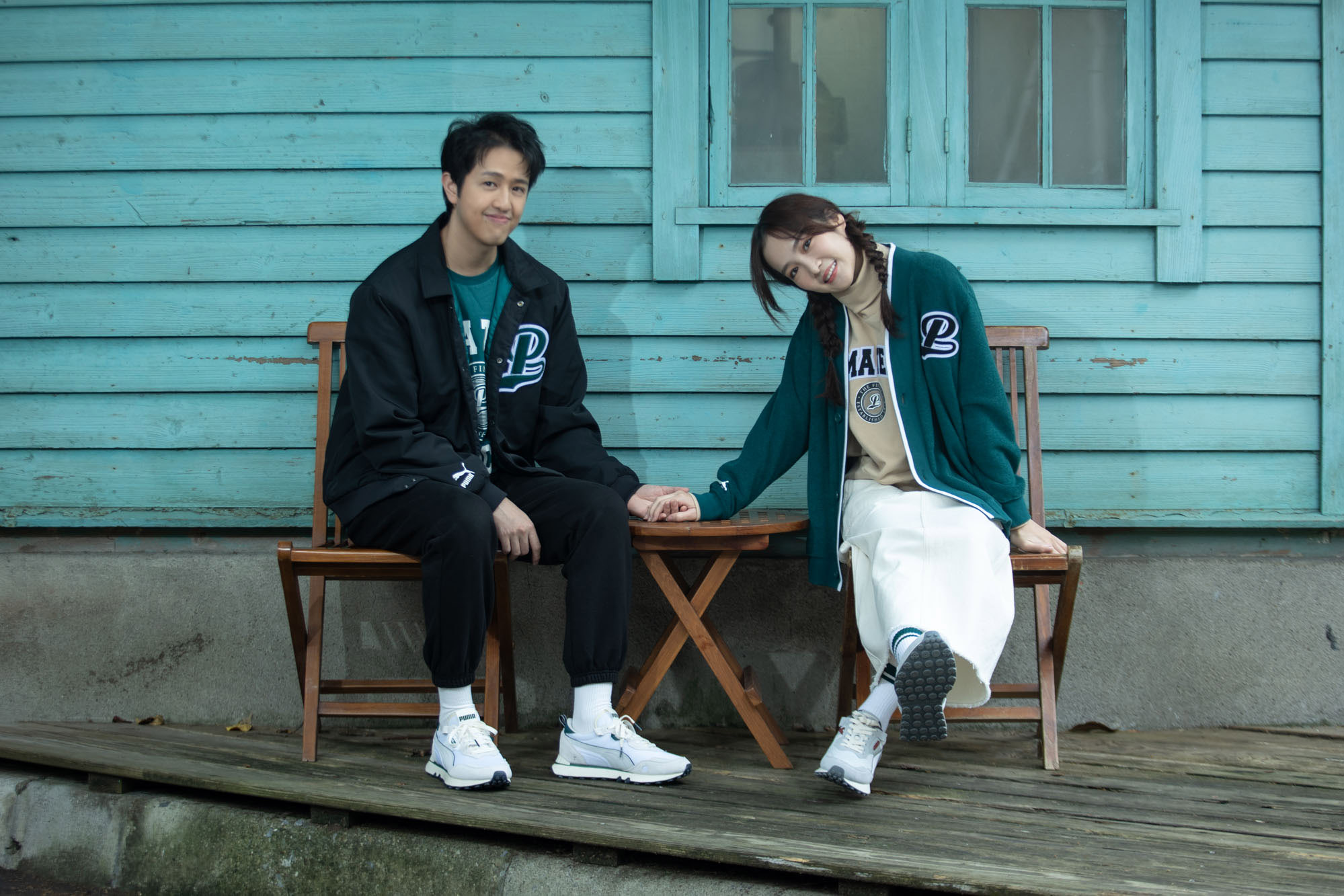 男孩與女孩腳上都穿著的是從1980 年代出產的慢跑鞋為基礎的 Rider FV,使用 Rider Foam 緩震顆粒鞋底技術,能夠有效吸收雙腳落地時的反向回震,加強穿著的舒適度,稜角方邊裁型的鞋跟,更為吸睛。鞋面材質更是亮點,用純白透氣網布為基底,鞋頭與後跟拼接上米色麂皮,鞋側 PUMA 招牌彎刀 logo 則是純白皮革,多重異材質拼接,局部裝飾了象徵性的酒紅色與綠色,點出了 Ivy Style 風格。