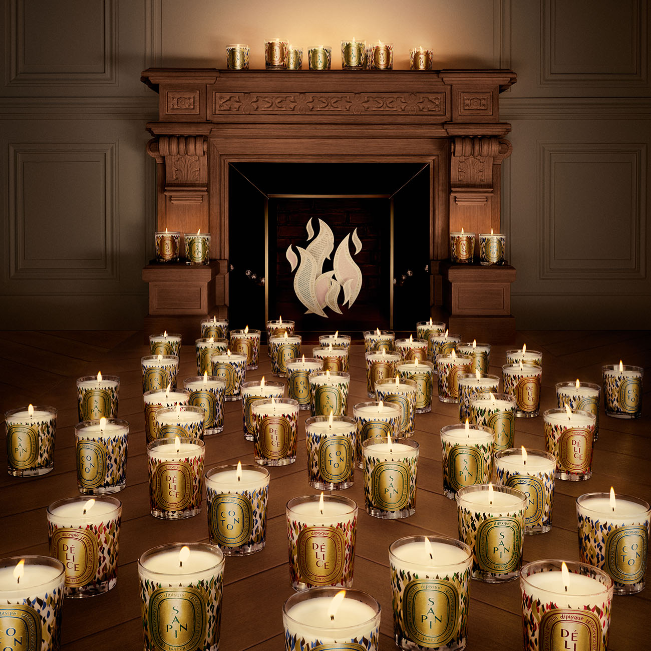 Diptyque2023聖誕限量蠟燭_形象圖5限量版經典香氛蠟燭,玻璃杯上有著黑色與金色組成的火焰圖案,包括冷衫、乾果與綿雪三款味道。 限量版經典香氛蠟燭,玻璃杯上有著黑色與金色組成的火焰圖案,包括冷衫、乾果與綿雪三款味道。