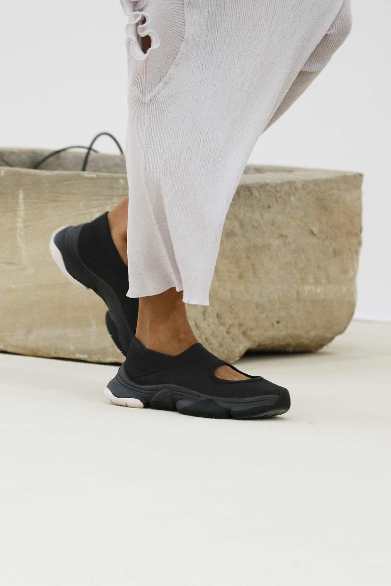 此次大秀有一款鞋特別吸引人, ISSEY MIYAKE 再度與 Camper 合作,以 Camper 經典的 Karst 鞋為基礎,打造了全新的 Karst Finch。Karst 首度是在 2021年推出, 看其名便知是一雙以 Camper 誕生地–特拉蒙塔納山脈的岩石景觀為靈感的鞋,設計概念來自大自然與攀岩,圓形鞋底的形狀類似懸崖。