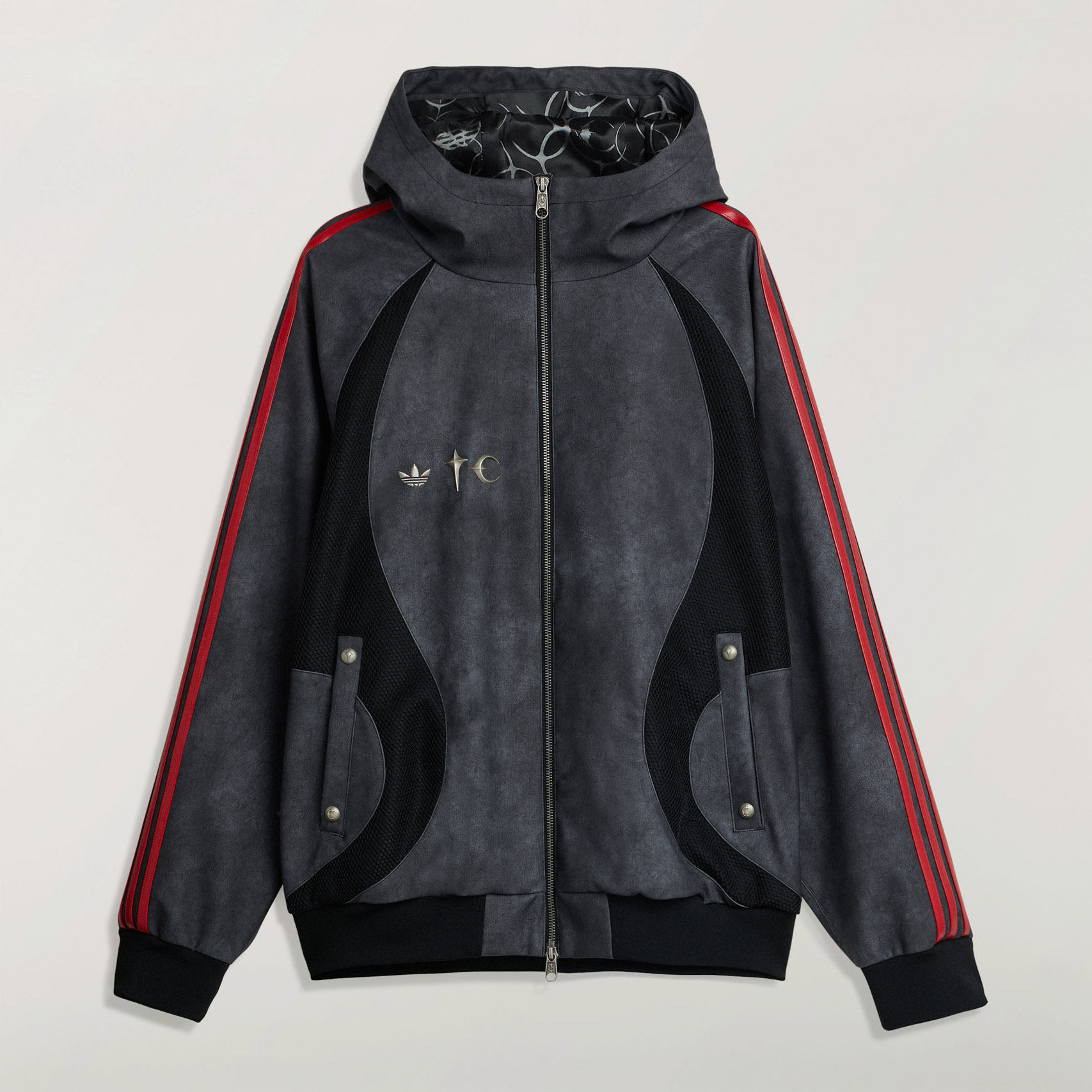 整個系列會看到劍、護甲、鋼鐵感、金屬徽章等「硬派」語彙,混進街頭廓形、oversize 版型、洗水工藝,形塑出一種帶有張力的穿著風格,既可以在街上走、也像穿著一件戰袍上陣,這種「運動傳統美學被叛逆重構」的姿態,正是這次聯名想要的宣告。