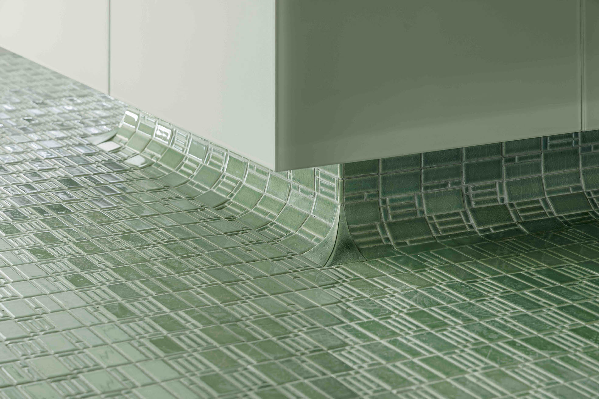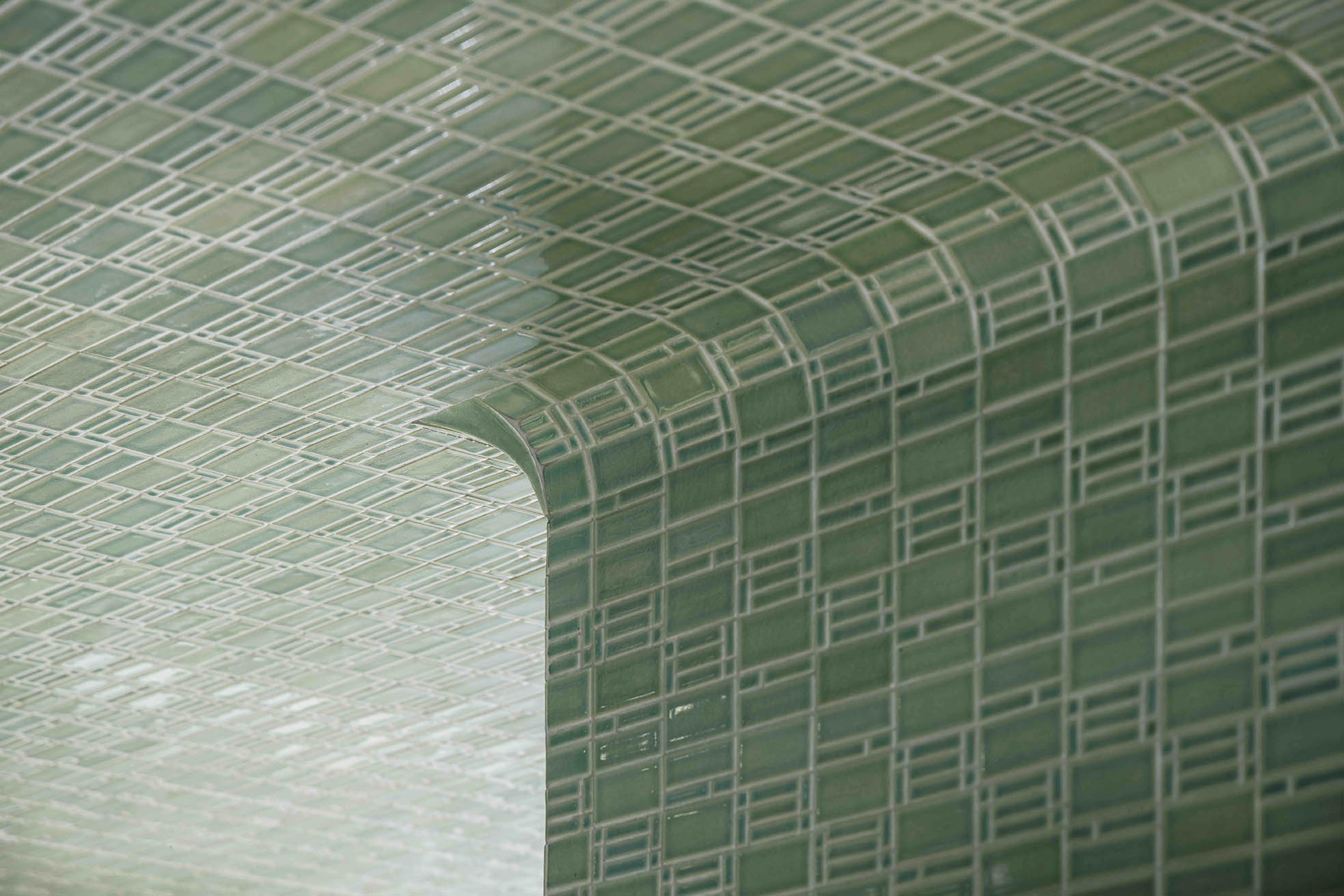 店內的每一片花磚都經歷真空加壓、3D 列印模具成形、800°C 素燒、再經 1230°C 高溫釉燒而成,老馬賽克花紋從地面一路延伸至牆面與天花板,透過圓角設計讓空間顯得柔和,營造出被花磚包圍的沉浸感。花磚主色是亞洲陶藝經典的青瓷綠,低調卻深邃,為了平衡材質的厚重感,再加入了錘紋金屬與霧面玻璃細節,形成剛柔並濟的層次。