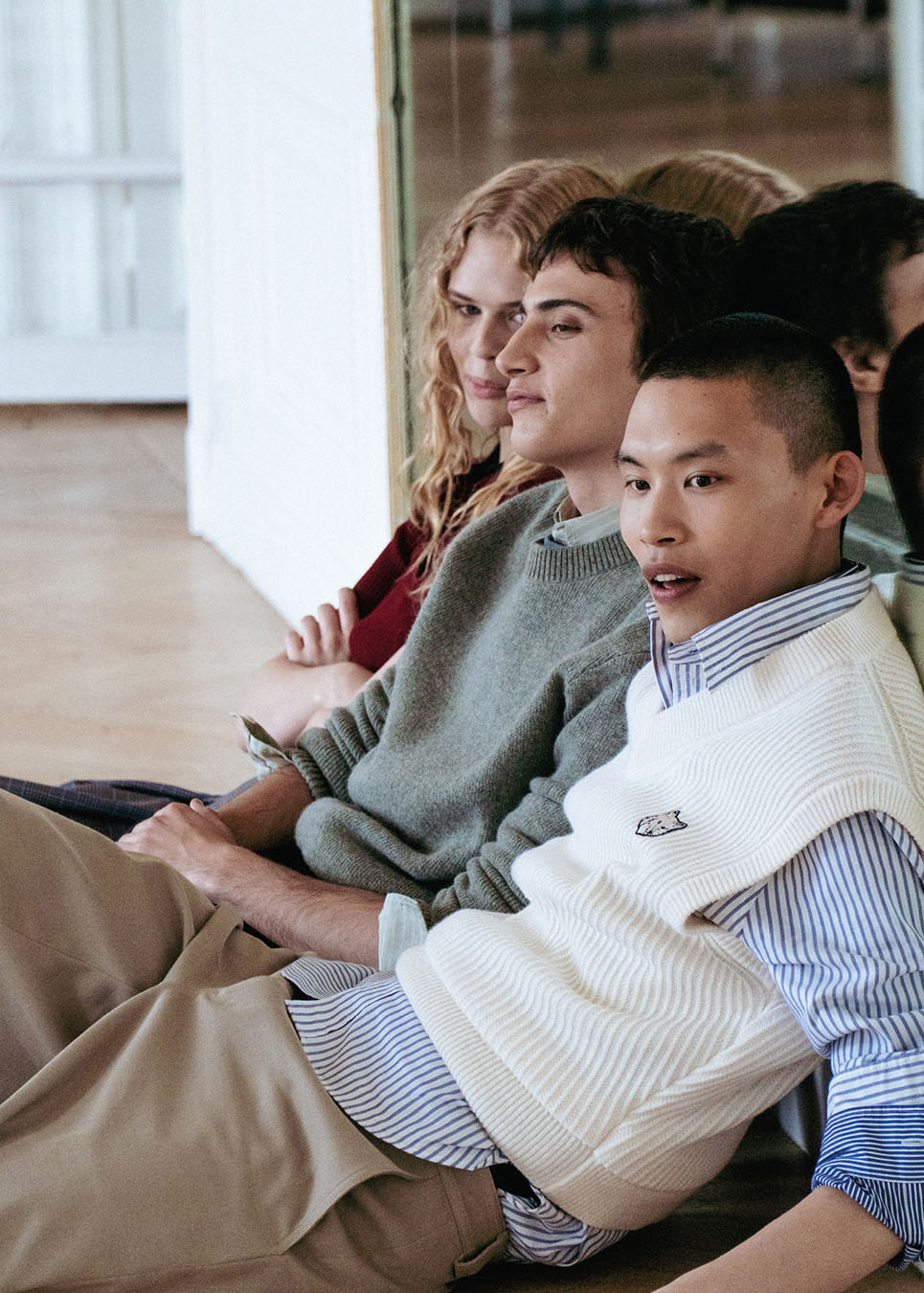 女裝以短版夾克、羽絨外套與百褶裙勾勒立體輪廓,男裝則推出西裝外套與羊羔毛夾克。針織系列是焦點:女裝有貝殼粉與鼠尾草綠,男裝則以毛海材質與字母編織展現溫度層次。