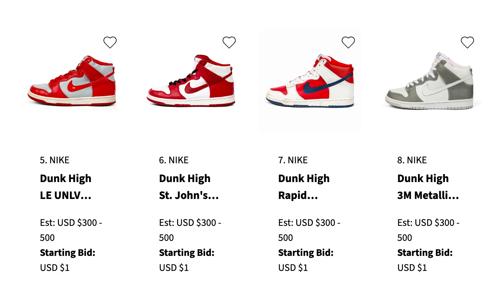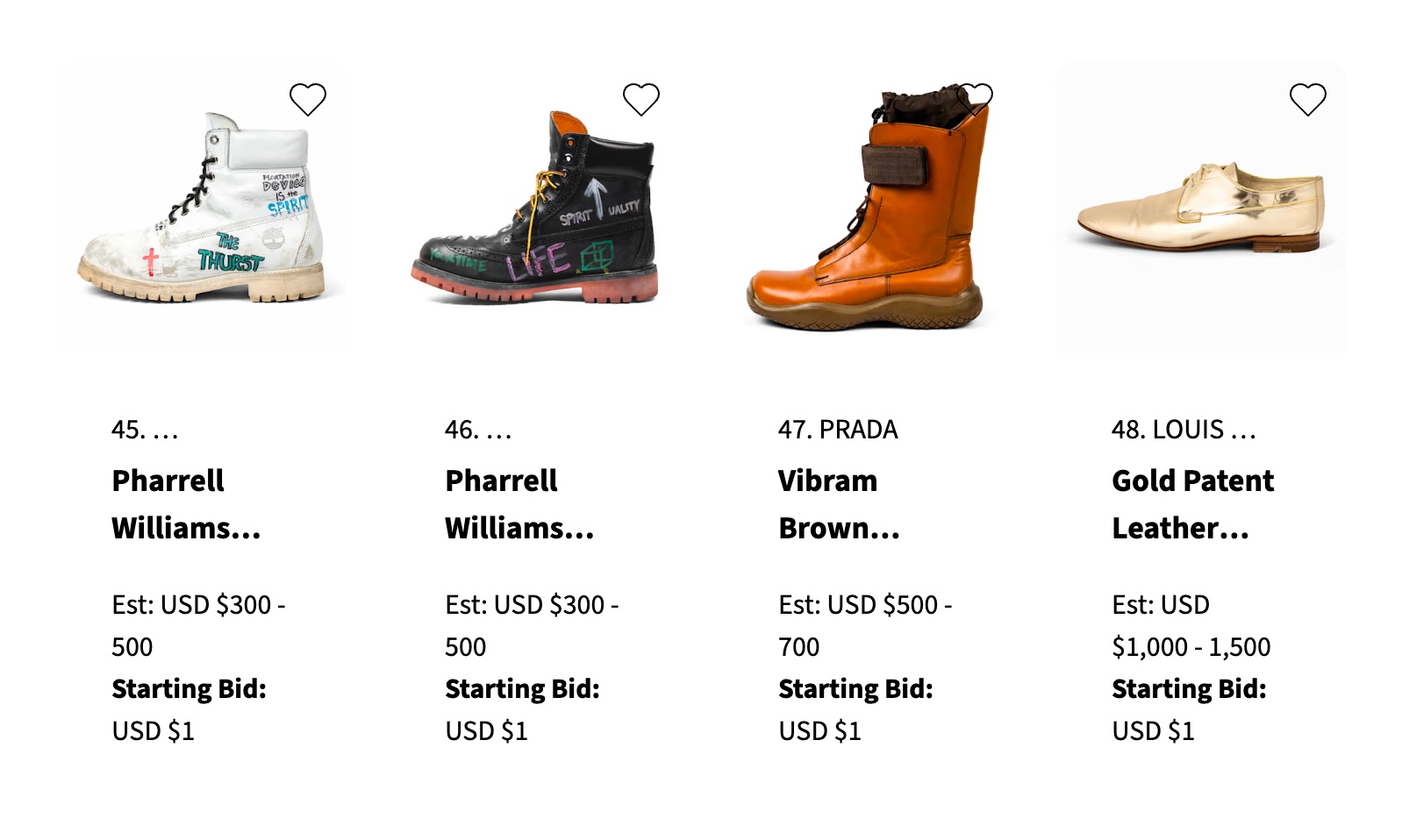 此次的拍賣品,涵蓋範圍甚廣,包括 2016 年作為親友限定款生產的 adidas x Pharrell Williams Human Race NMD Trail Respira 樣品,2000 年代初的 BAPESTA FS-001s、市場上少見的 BBC Ice Cream x Reebok Boardflips;Pharrell Williams與 adidas 合作的經典鞋款,以及Louis Vuitton正裝鞋,還有 20 雙罕見的 Nike Dunk ,其中有一雙是極其限量的 2002 年 Nike x Undefeated Dunk High HyperStrike ,以及兩雙由他本人訂製的 Timberland。