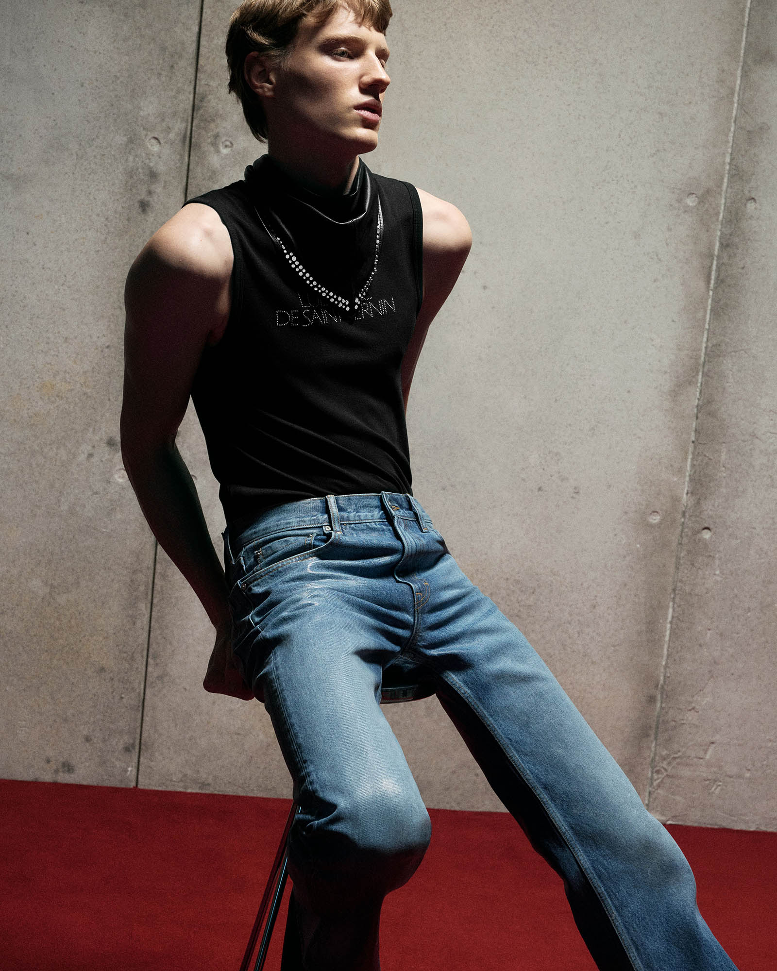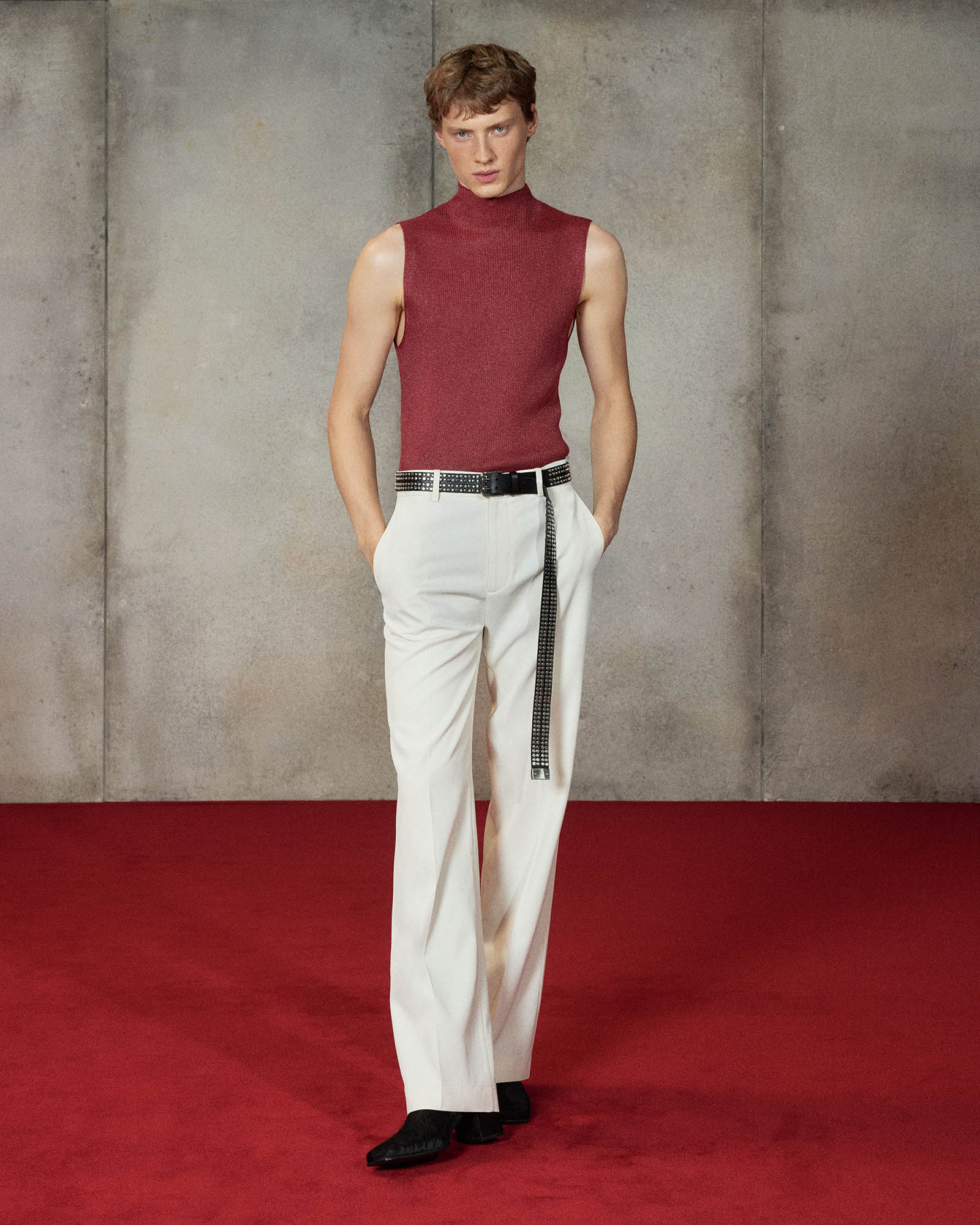 整個系列結合帶點 BDSM 式性感的金屬鉚釘,還有結合光澤濕度與滑面的 Satin & Waxed Denim 材質,呈現在皮革風衣、迷你連身裙、疊層腰帶和手套,輕盈金屬網狀面料,為露背上衣、修身禮服和迷你裙,增添了 Ludovic 標誌性的性感現代光澤,Ludovic 皮革工藝體現在各種版型的外套、拼接飛行員夾克和長褲。