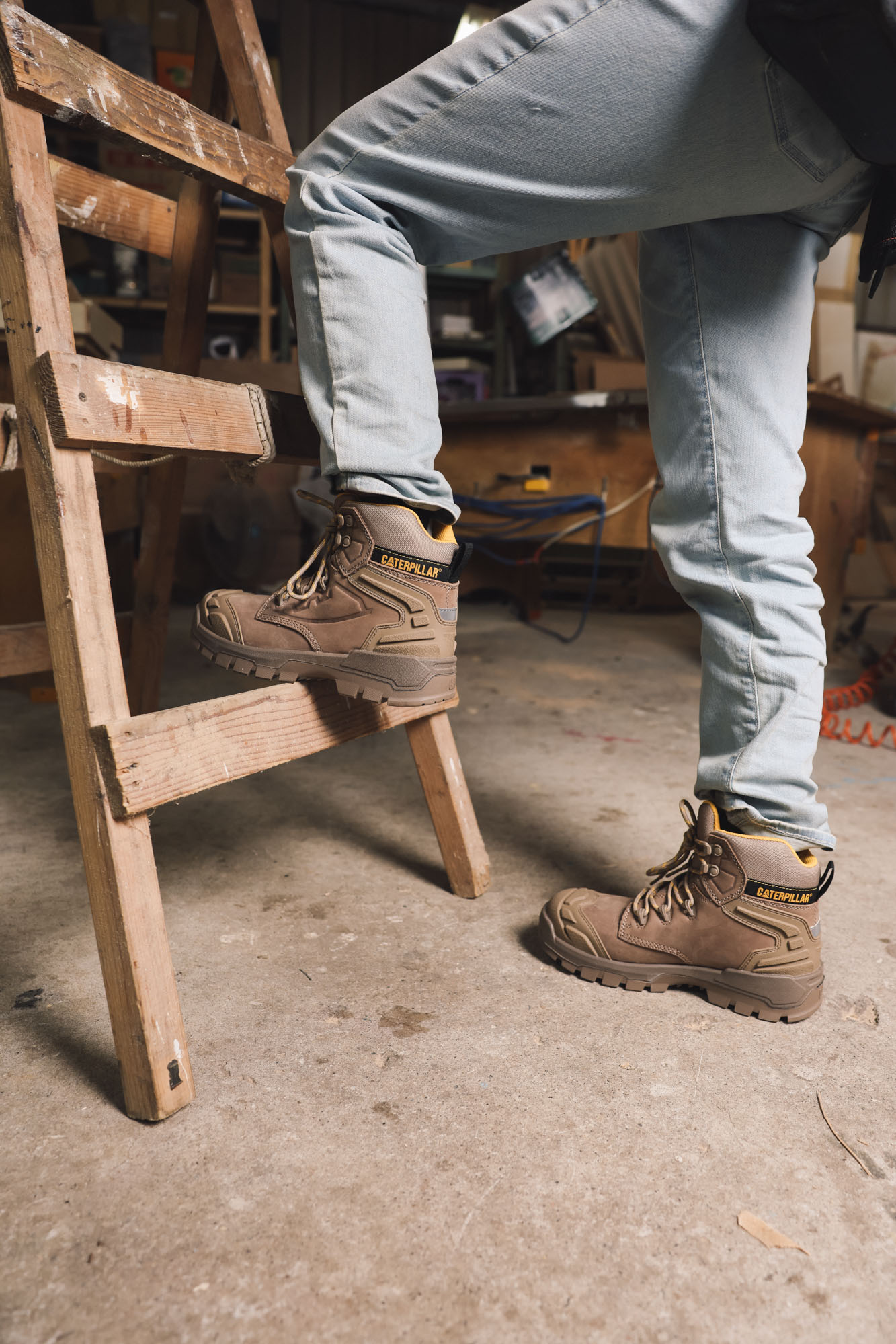 「首先這雙 CAT 工作靴外型看起來很有分量,實際穿著其實還蠻輕的,裡面的底是軟的,踩起來舒服又穩定。底夠厚,不用擔心在案場會不小心踩到異物。鋼頭有防護力,很重要的是腳趾不會頂到鋼頭,透氣很好,我很不喜歡工作一整天腳是悶著的。