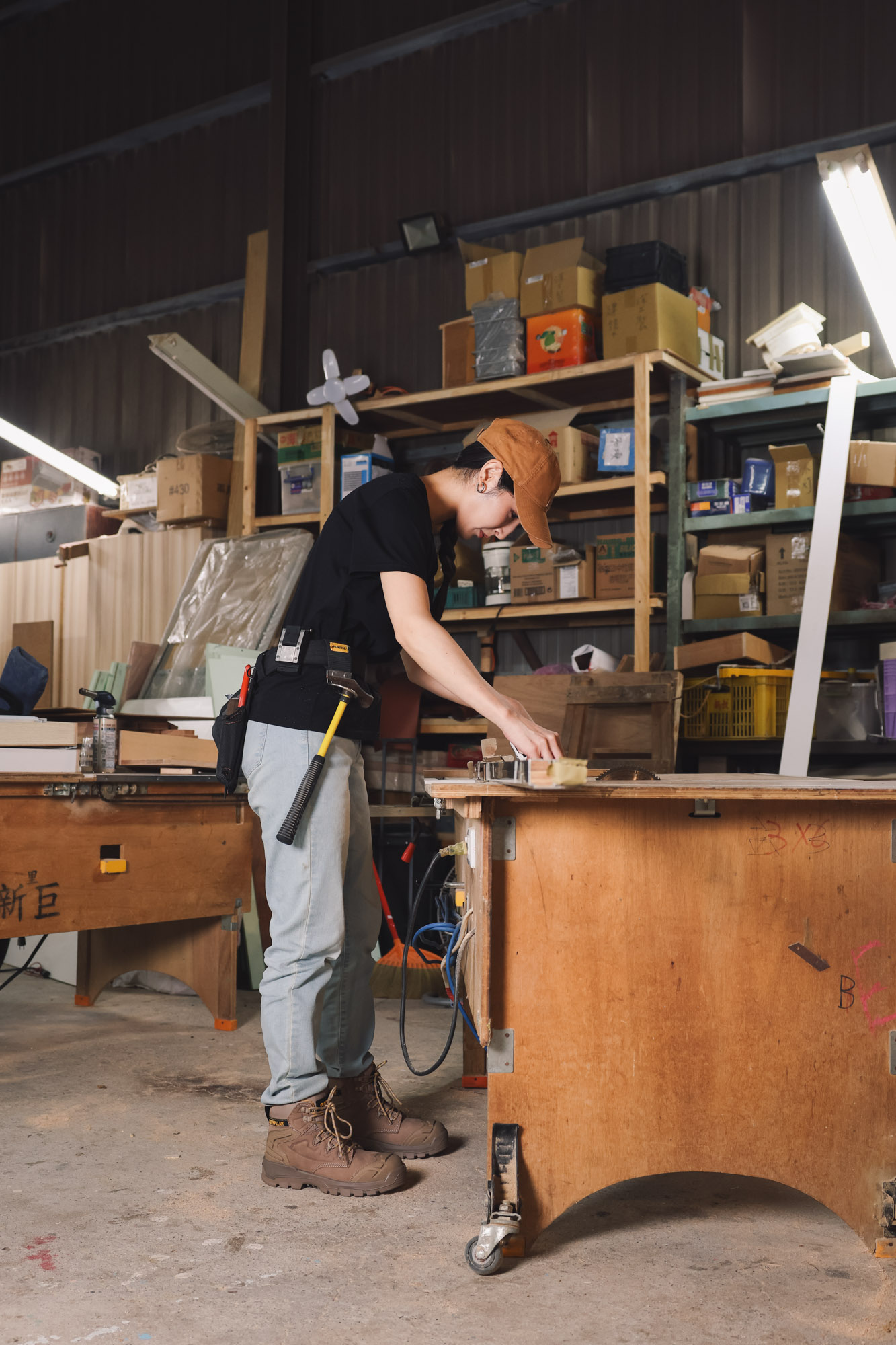 KEEDAN 這次跟工作鞋專業品牌 CAT 合作,一起紀錄這些勞動者的群像,繼太陽下的男人、宅水電油漆職人葉師傅之後,此篇主角是甚為少見的女生木工職人—阿彤。