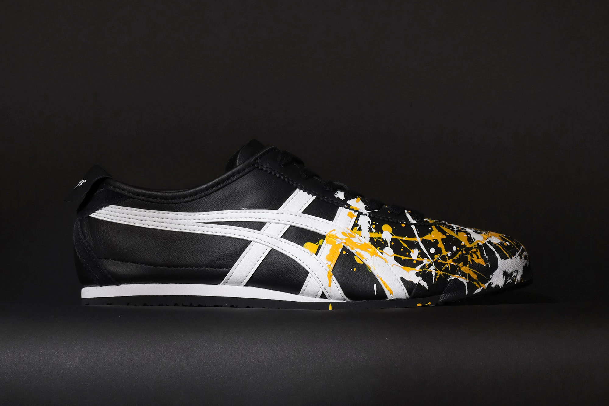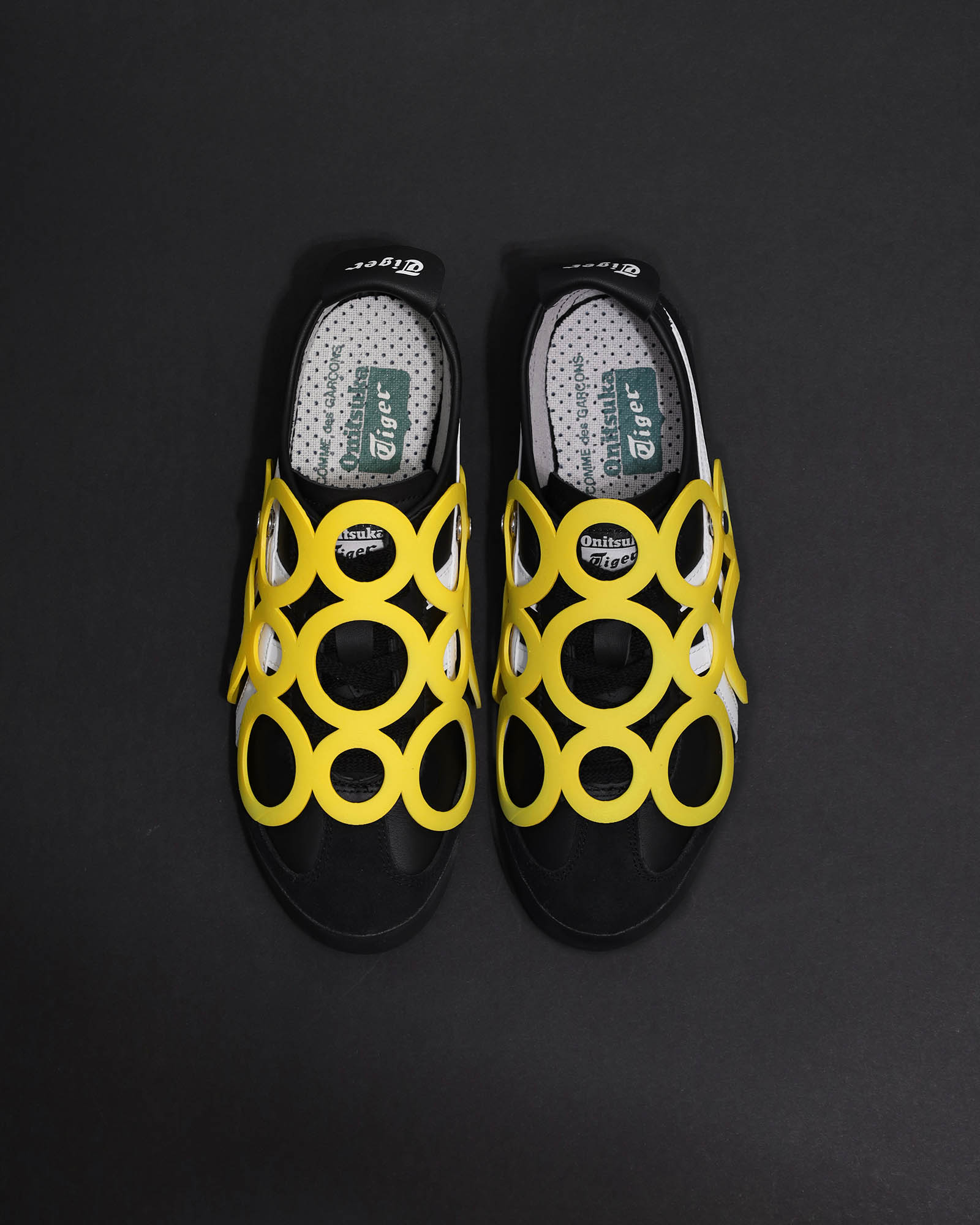 接著則是與 COMME des GARÇONS 的聯名系列。整個概念是以 ONITSUKA TIGER 經典的 MEXICO 66 為基礎的四款鞋,以及 Tiger Yellow 為主色調的服裝。先從 MEXICO 66 看起,包括加上波墨的鞋頭,加粗的鞋帶,或是綴有 CdG 招牌圓圈,最特別莫過於以鞋套再套於 MEXICO 66 上面的設計,都讓 MEXICO 66 變得更活潑吸睛。