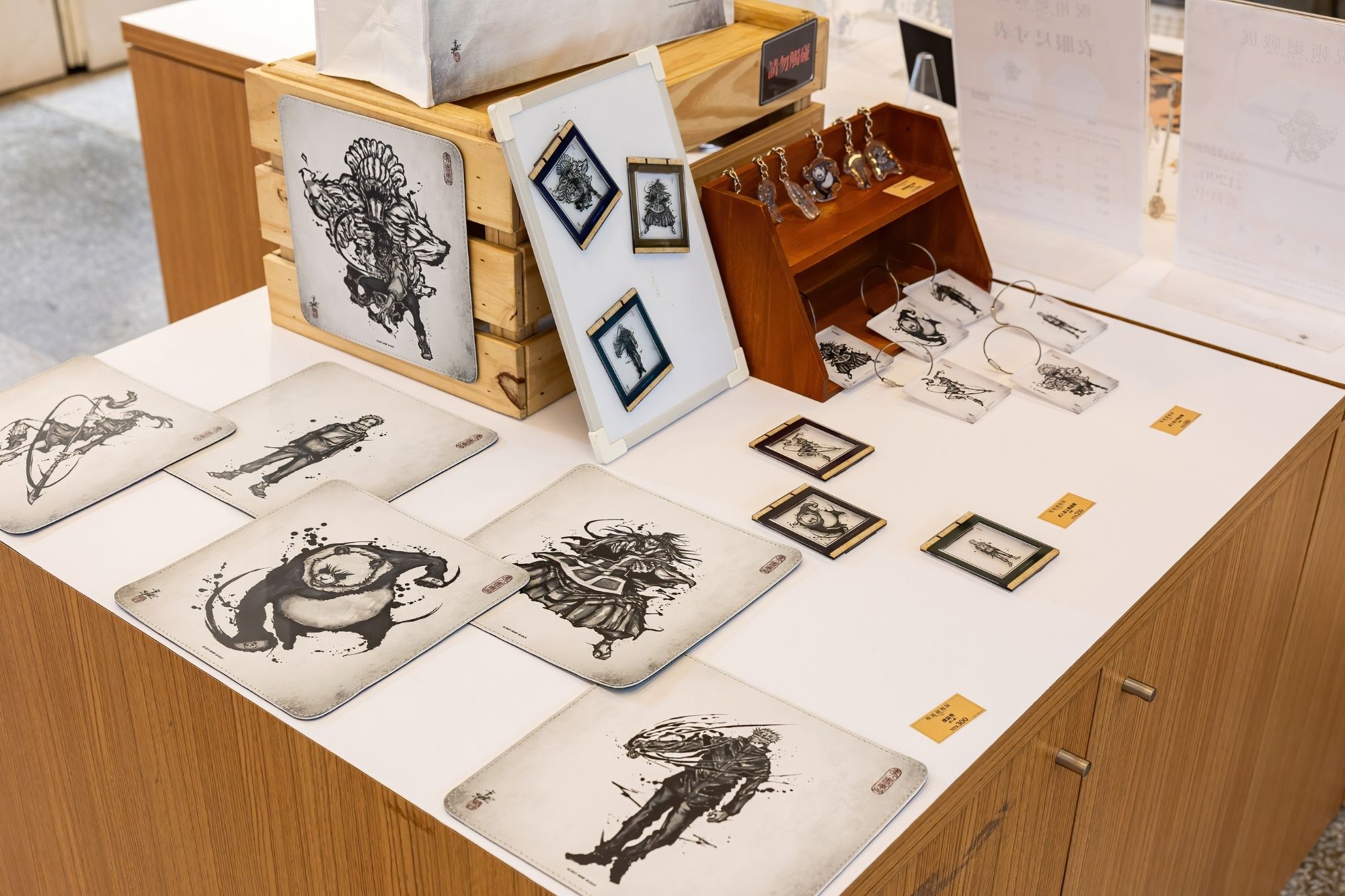 台北站同步推出多款限定周邊商品,從吊飾、畫框磁鐵到實用型配件皆一應俱全。其中最具話題性的,是由知名武人畫家こうじょう雅之(Kojo Masayuki)為展覽全新創作的武人畫系列作品。畫作以「武人」精神重新詮釋《劇場版 咒術迴戰 0》的角色形象,並延伸製作成帆布袋、滑鼠墊、壓克力牌等多項限定商品,讓粉絲能同時收藏展覽限定、台北限定與武人畫限定。