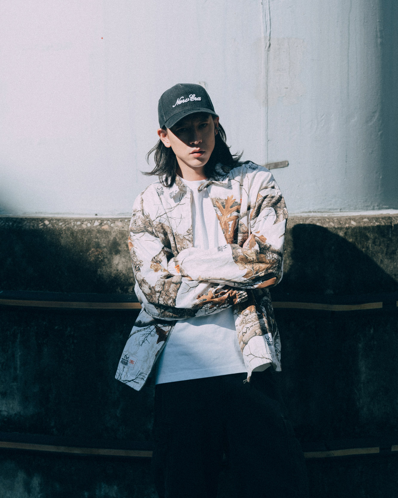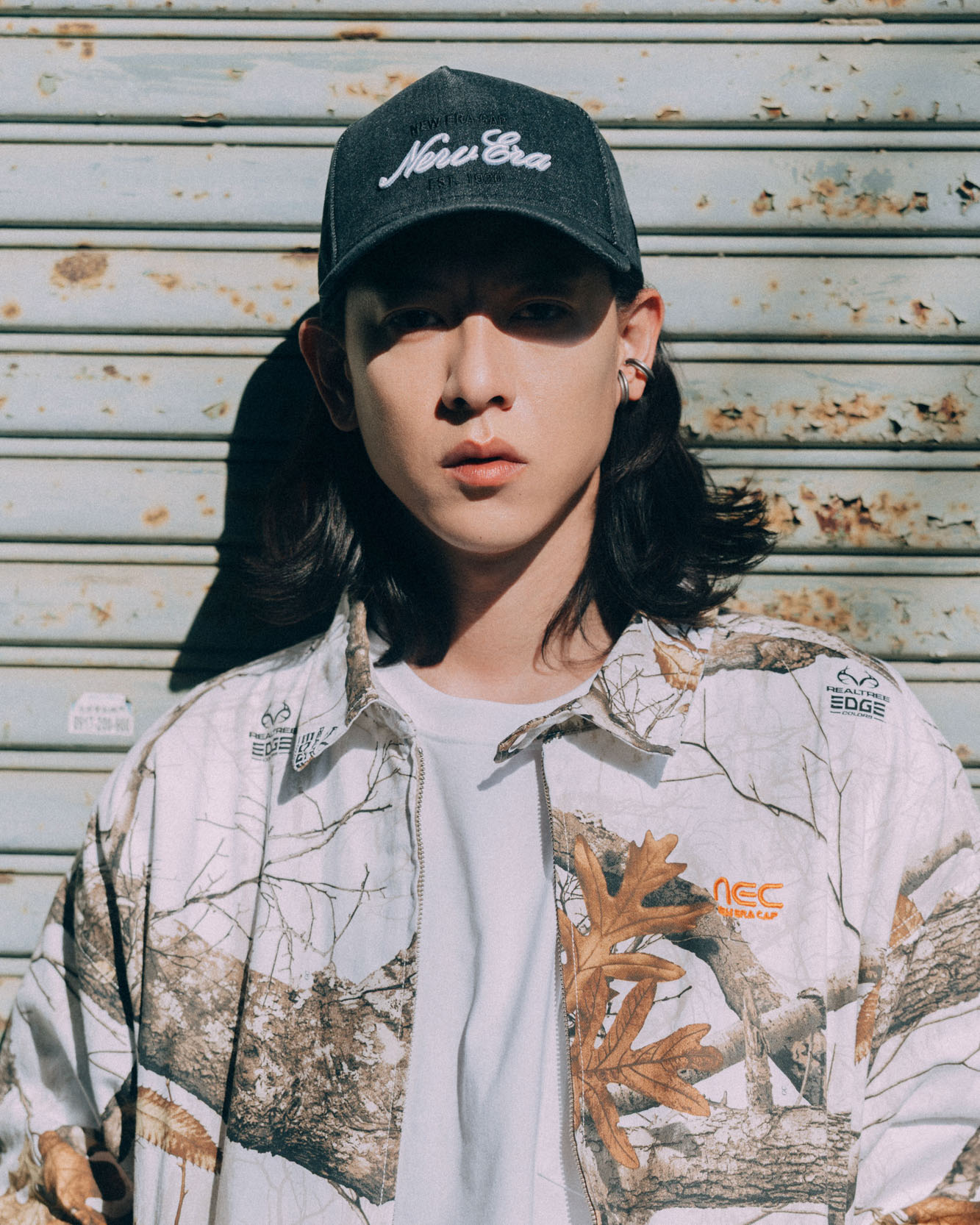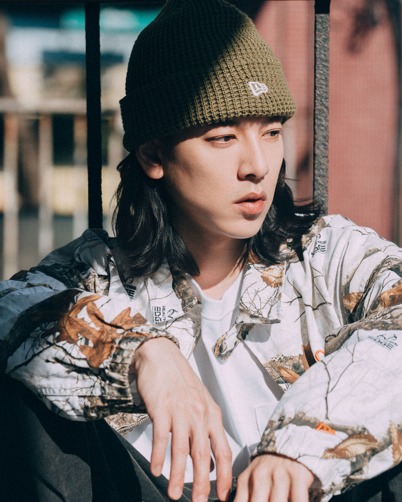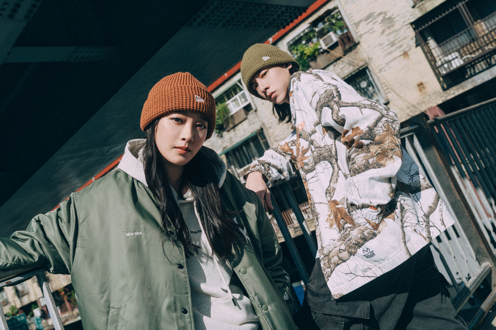 男孩女孩戴的是同款不同色的毛帽。先從男生來看,戴毛帽的時候,很適合將略長微卷的頭髮放下,帽簷反褶處下拉稍微蓋住耳朵,視覺上是平衡的。外套刻意選擇了使用了 Realtree 布料 EARTHY SKIN 外套,特色就在於極為逼真的樹木枝葉圖案,背面印著 nec (NEW ERA COMPANY)字樣,與針織毛帽的顏色彼此呼應,下身則為現在很主流的寬褲。