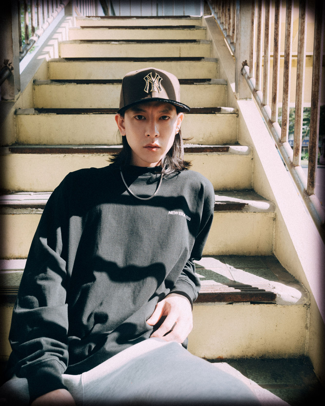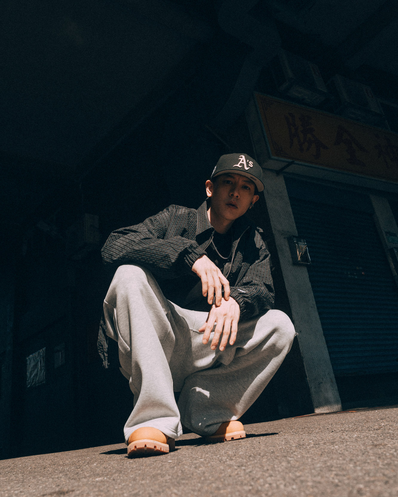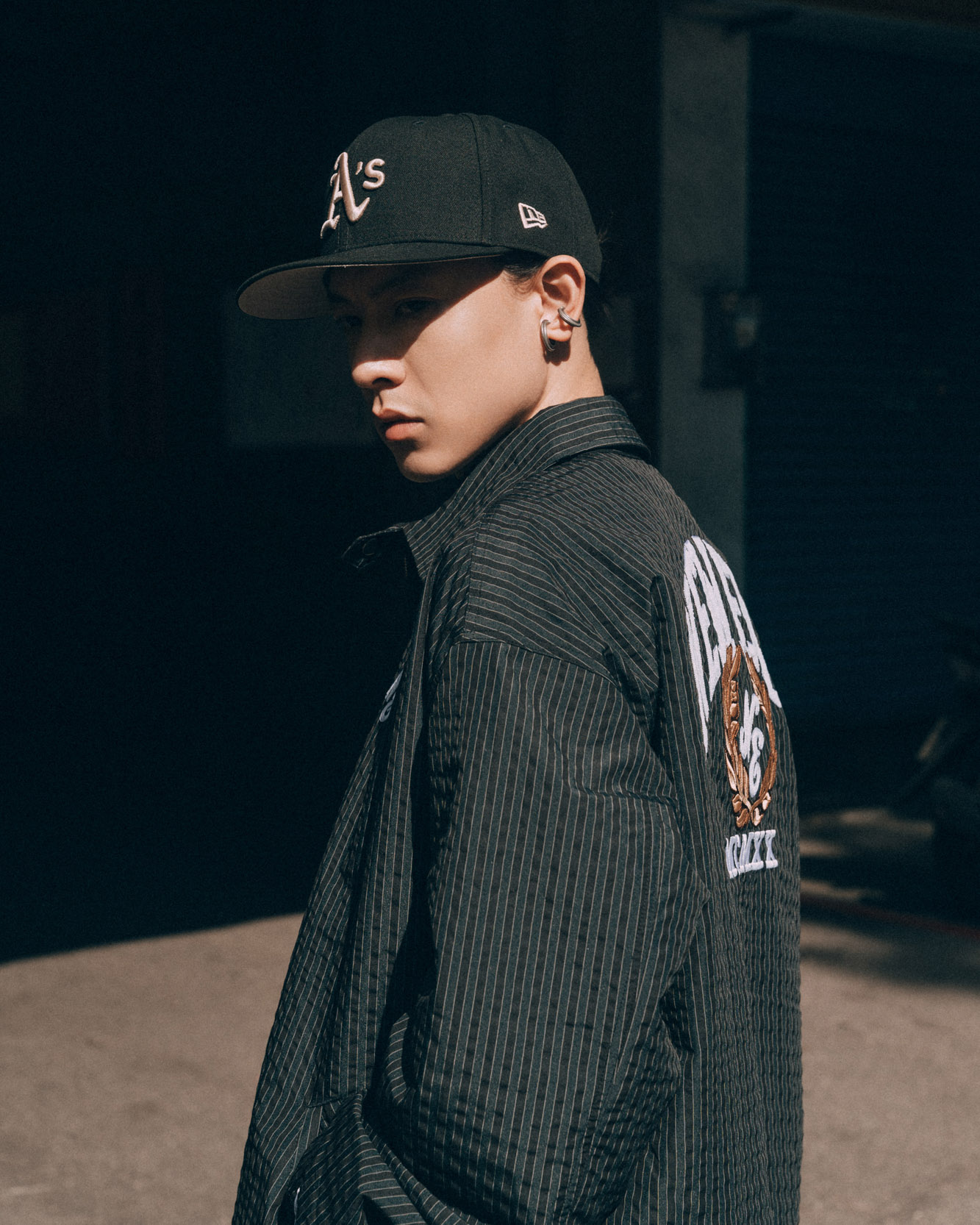 既然如此,就把長髮綁起來,再戴上奧克蘭運動家隊世界大賽系列 9FIFTY,讓帽型跟臉型線條都更為明顯。搭配 STREET CLASS 海軍藍外套,有著條紋裝飾,下身則為版型很挺的運動褲、經典黃靴,整體很街頭感。