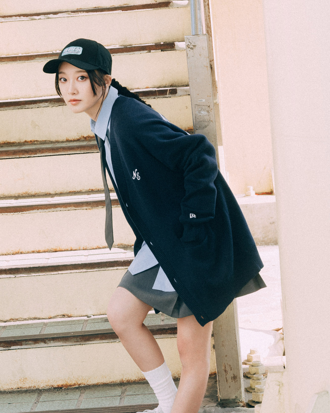 Logo的呈現方式有很多種,女生戴的這頂 9FORTY,藉由布標方式將「NEW ERA CAP COMPANY」裝飾於帽身,後方繡有「The Cap The Pros Wear!」的口號,設計更為青春活潑。搭配以長春藤學院風為基礎,襯衫搭配長版針織外套,後面有長春藤圖案,「MCMXX」則是寓意「1920」,下身則是百褶短裙與芭蕾舞鞋,領帶則有畫龍點睛效果。