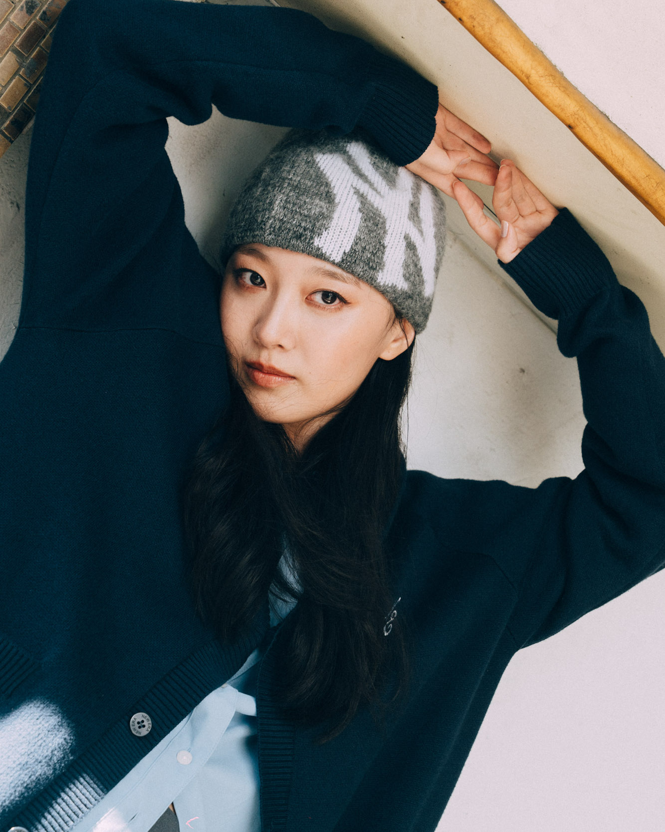 女生則以雪松棕色的針織毛帽為主角,搭配走的是一個街頭 boyish 風格,oversize 的日版 OOTTF 帽 T ,靈感來自「Originators of the True Fitted」的品牌概念,11oz純棉布料,穿著感舒適。搭配韓版 AP MLB Nylon Stadium JK53,屬於紐約洋基隊 Sage 尼龍球場外套,內裡使用了 3M Thinsulate Advanced 保溫棉,這是一種輕薄科技保暖材質,強調能夠捕抓保留身體熱能,兼具透氣,正適合這個天氣。