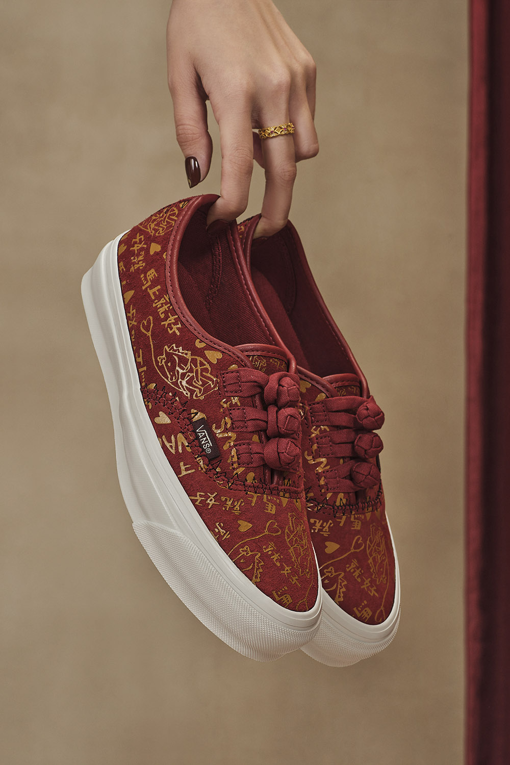 系列以兩款 Vans 經典鞋型為主軸,將新年祝福轉化為可穿戴的設計元素。Premium LX Authentic 44 Knot 以 Authentic 原型為基礎,結合中式盤扣與透明水晶格紋大底,紅色鞋身搭配金色水墨線條,並透過不規則縫線呈現街頭感與傳統元素之間的對比。全皮鞋面與調整後的鞋型比例,使整體外觀更為俐落,適合節慶與日常搭配。