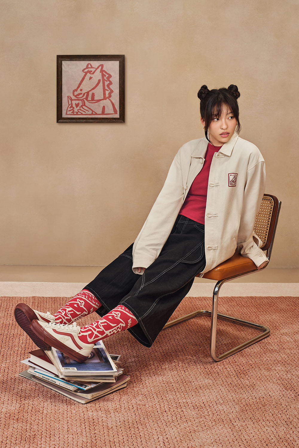 服飾系列以紅色為主線色彩,結合水墨塗鴉線條,延續鞋款的視覺語言。單品涵蓋襯衫外套、長袖 T 恤 與 POLO 衫,剪裁上融合中式服裝輪廓與街頭風格比例,兼顧層次感與實穿需求。盤扣、織標與印花細節被有節制地運用,使節慶元素自然融入日常穿搭之中。