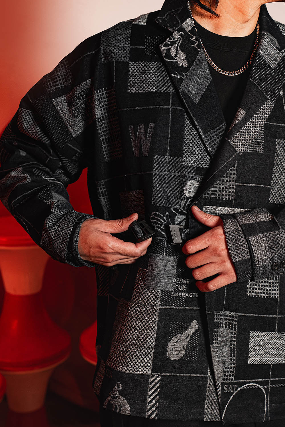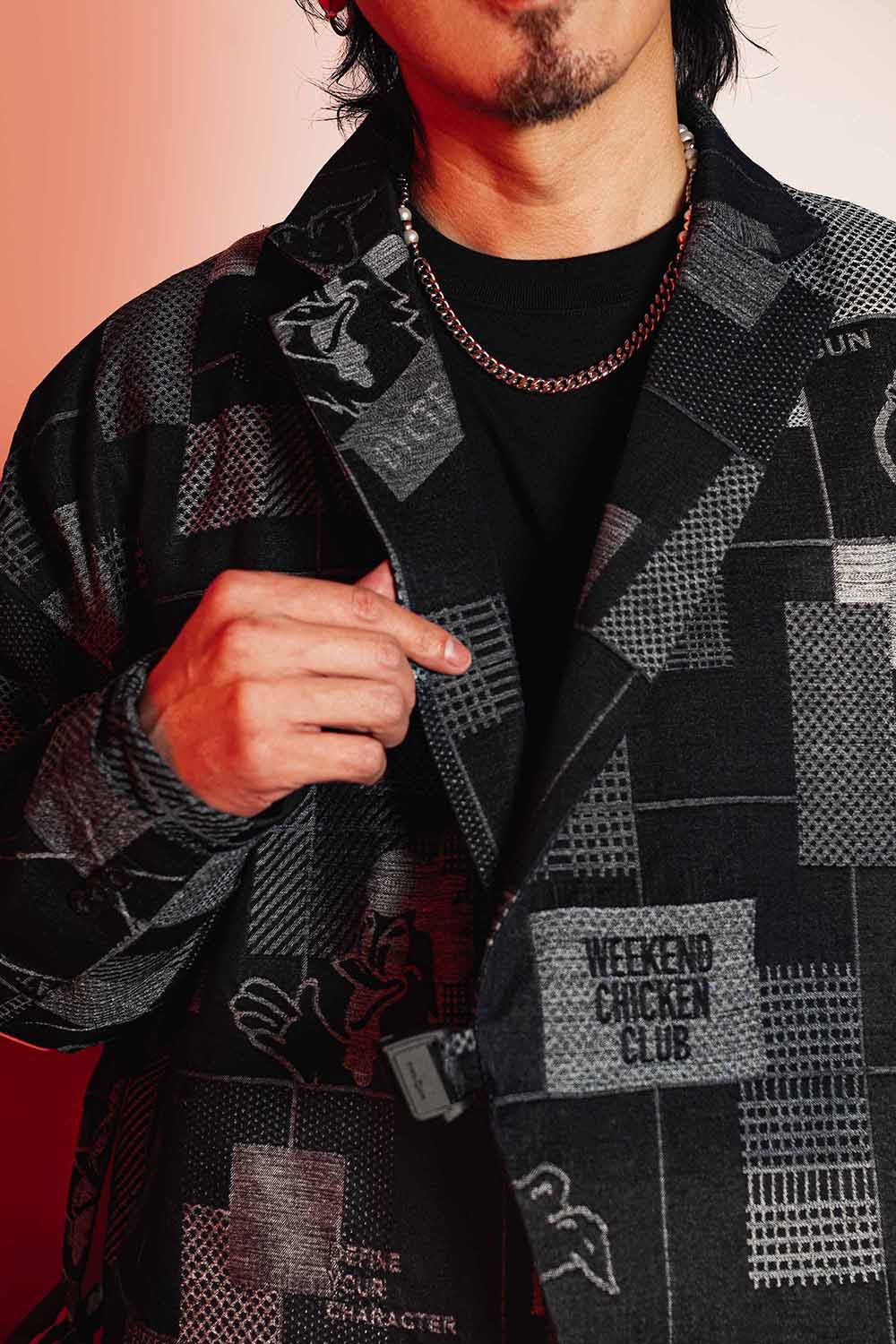 本次合作的一大亮點,是 DYCTEAM 為 WEEKEND CHICKEN BAR 團隊打造全新專業制服。DYCTEAM 相信,好的設計不只是外觀好看,而是能賦予穿著者力量,並成為與顧客互動的視覺語言。為了保留週末炸雞的態度又不失時尚質感,DYCTEAM 以《Neon Weekend Grid》緹花面料為核心,打破大眾對 Bartender 吊帶褲的刻板印象,改以「微正裝」語彙重新塑型。聯名緹花寬鬆西裝外套以微寬鬆版型搭配俐落線條,並加入便利磁扣設計,讓調酒師能在高強度的吧台節奏中依舊維持造型完整,同時確保行動流暢;而針對廚房職人長時間處於高溫環境的需求,DYCTEAM 推出 Neon Weekend Grid 減壓雙肩圍裙,捨棄傳統繞脖結構,改採肩帶式設計以減輕頸部負擔,讓夥伴能更專注投入創作。
