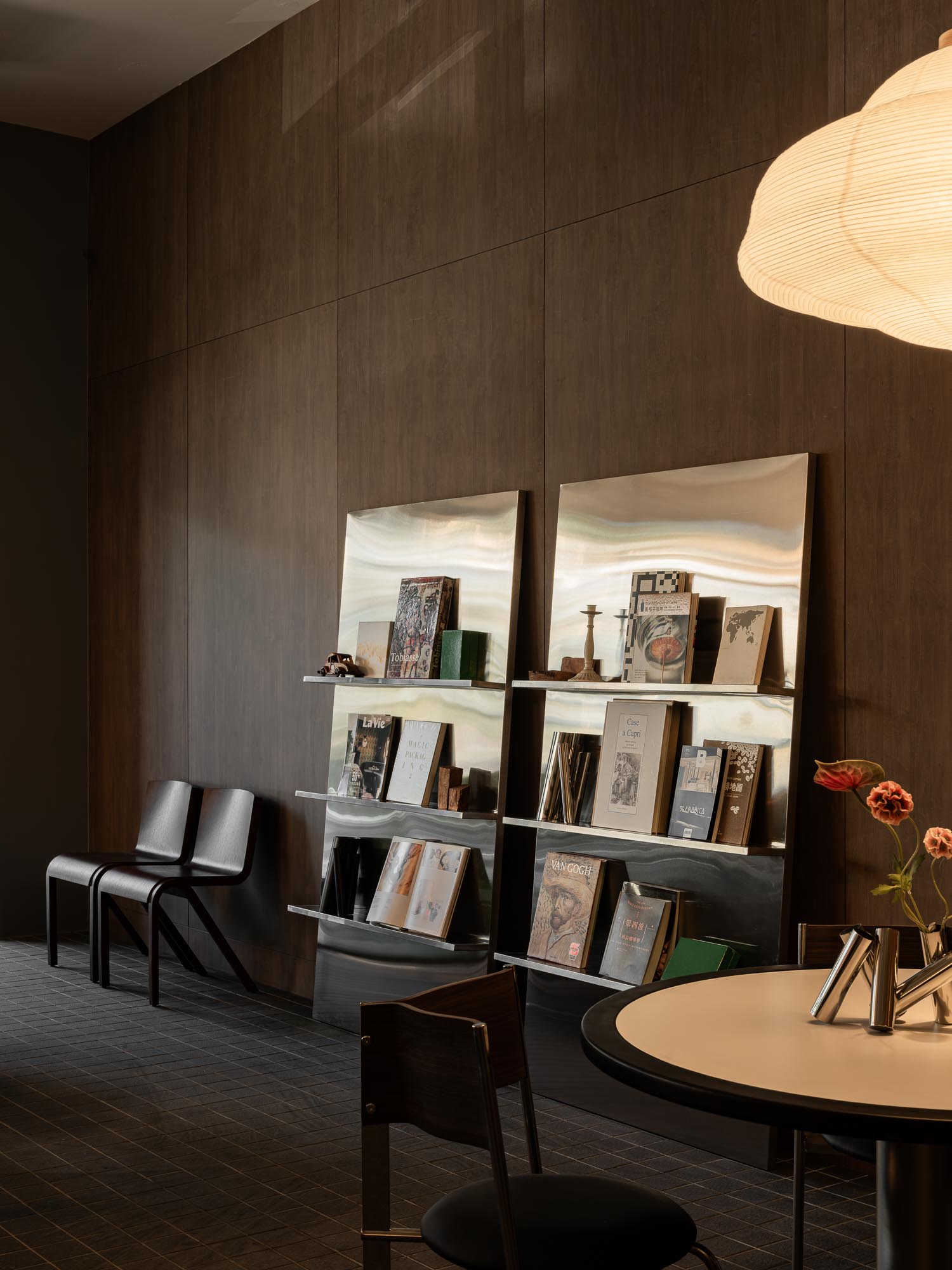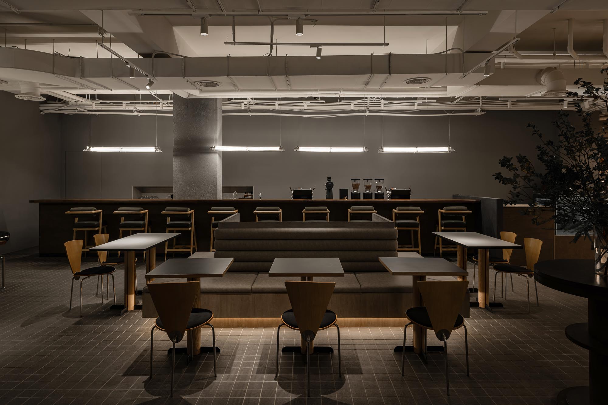 DUM DUM x Phase Coffee Roasters 水湳店的空間由不醒人室內裝修操刀設計,以規律的方格地磚建立理性秩序,長型吧檯透過外露管線與沉穩木作,呈現「上輕下重」的視覺平衡。利用森林綠的絨面椅與台灣品牌「柒木」的紙燈籠吊燈,柔化了金屬與混凝土的冷硬感,也是與 DUM DUM 的品牌特色做呼應。