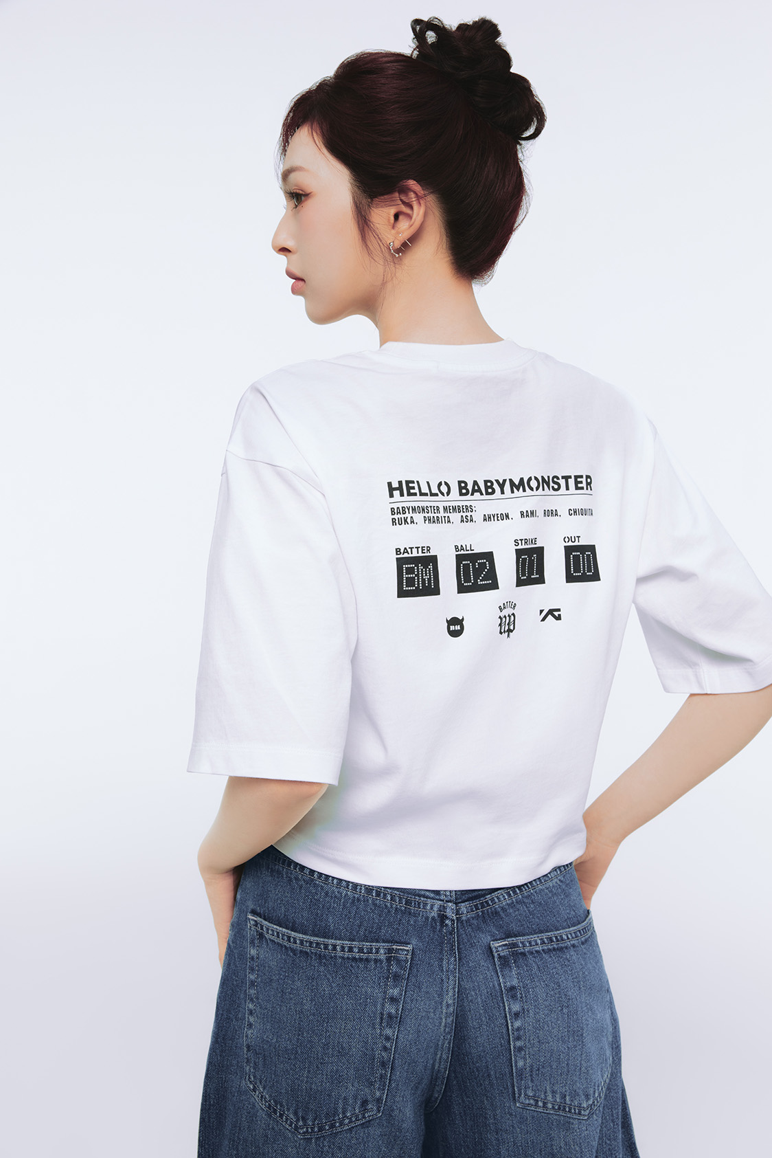 這次的 BABYMONSTER UT 系列總共有 6 款女裝印花 T 恤,以出道曲〈BATTER UP〉為靈感,稍寬剪裁,並加入 具透膚感的布料選項,提供圓領與 V 領兩種款式,讓穿搭在街頭與日常之間保有更多彈性。視覺延續 BABYMONSTER 在舞台上呈現的酷帥形象,透過圖像與字樣配置,將團體世界觀具象化到 UT 裡。