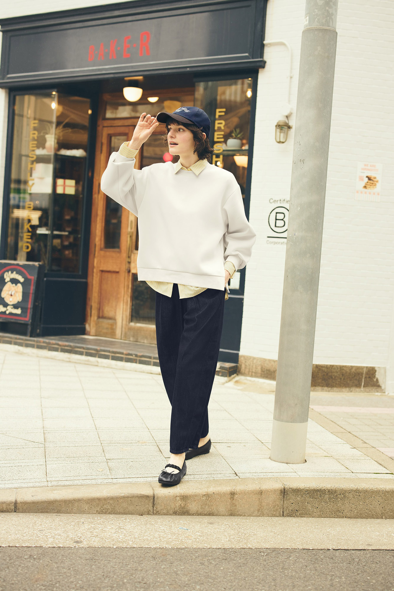 這類錐形、寬版但不拖地的褲型,最大優點是修飾比例、也不受鞋款限制。無論搭配針織、襯衫或簡單 T 恤,都能快速完成造型,是最百搭的選擇。