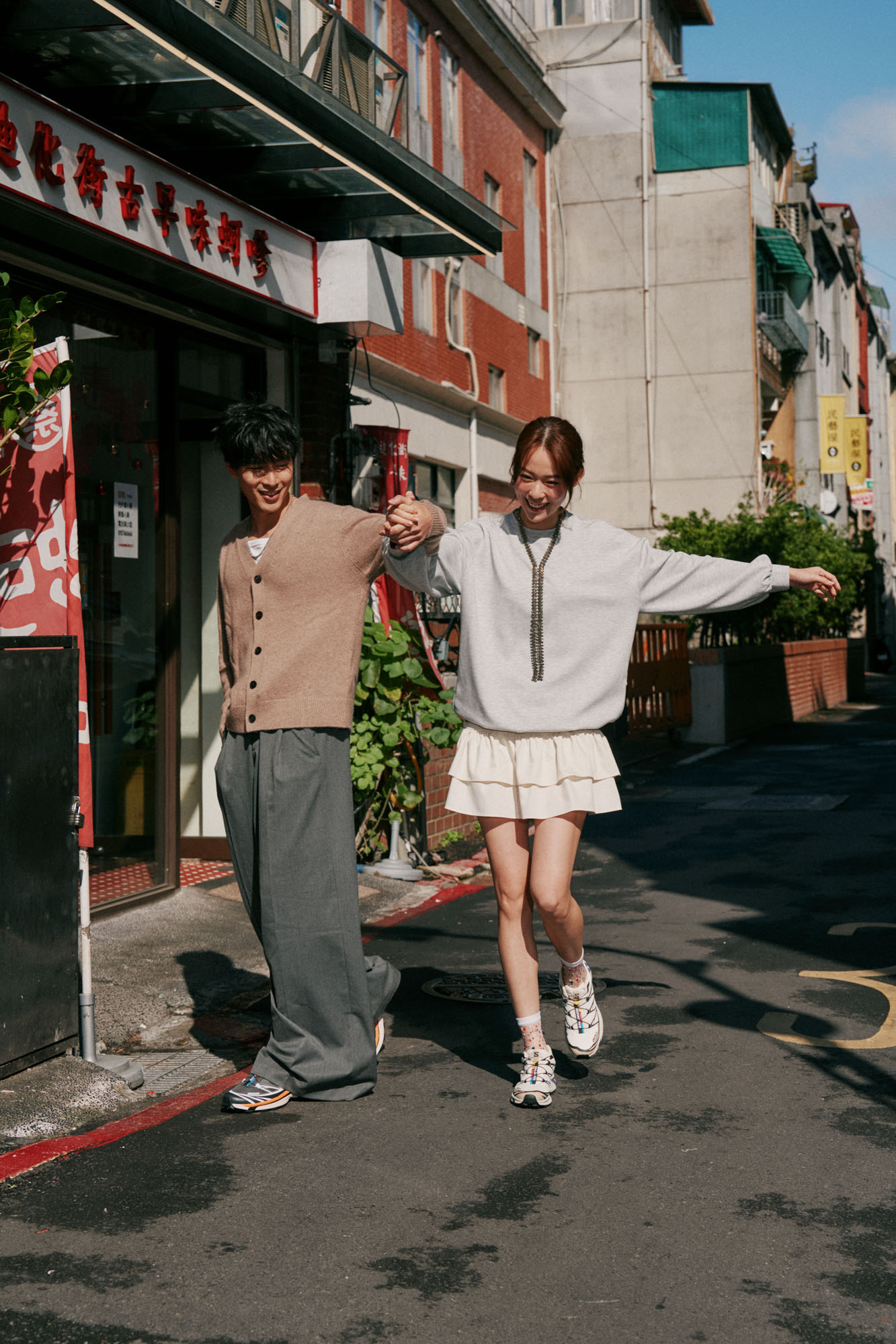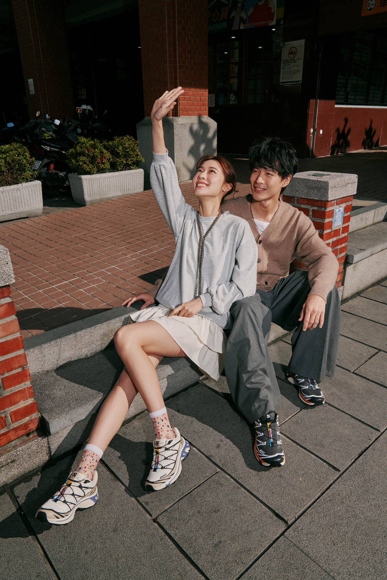例如「灰色」就很適合大面積,女孩的灰色小洋裝,上半部是運動衫材質,拼接荷葉百褶短裙,男生則是今年流行的灰色寬版彎刀褲,以深淺不同的灰色做呼應。有發現一個細節嗎?女生穿的網紗短襪,上面的點點配色是與 Salomon 鞋舌的織帶相同,穿搭就是這麼有趣,有很多小心機可玩。