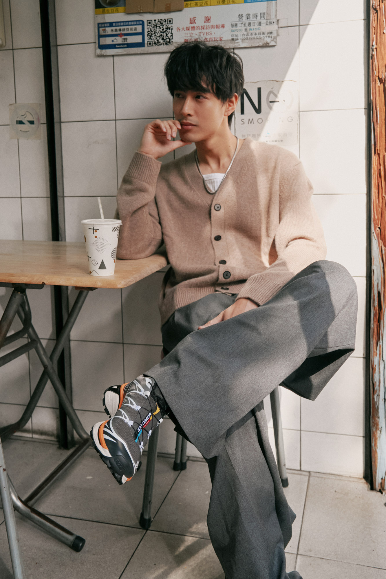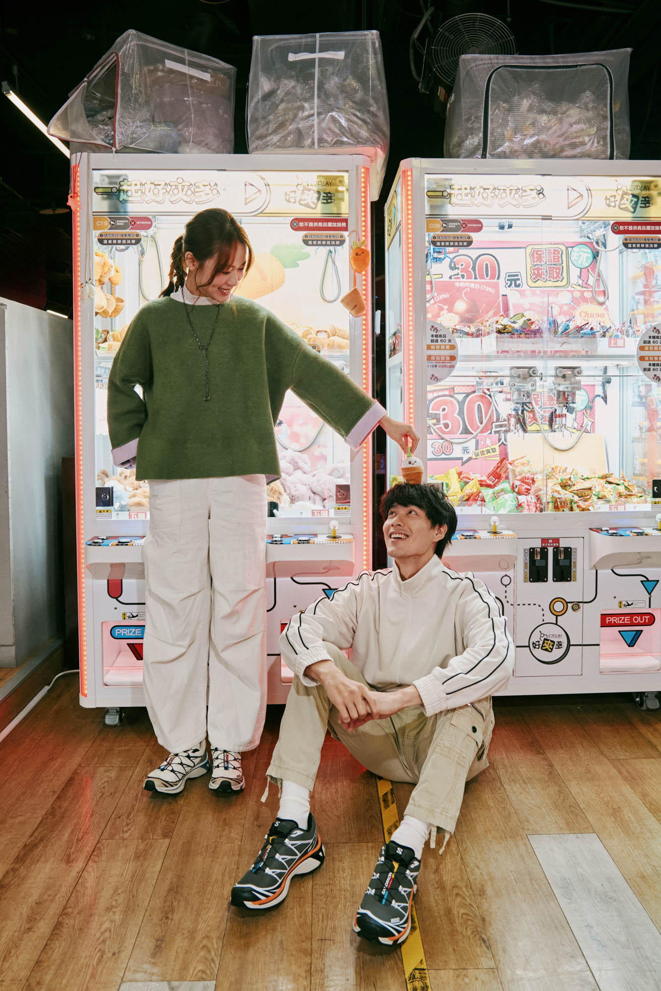再來是「色系」的對話: 以女孩腳上那雙白色的 Salomon XT-6 為靈感基調。女孩可以穿上白色縮口褲、搭配蕾絲高領內搭與綠色針織衫,讓視覺層次更豐富;男生則以白色運動外套與卡其色縮口褲來回應,褲款的選擇正是呼應女生穿搭的小心機。