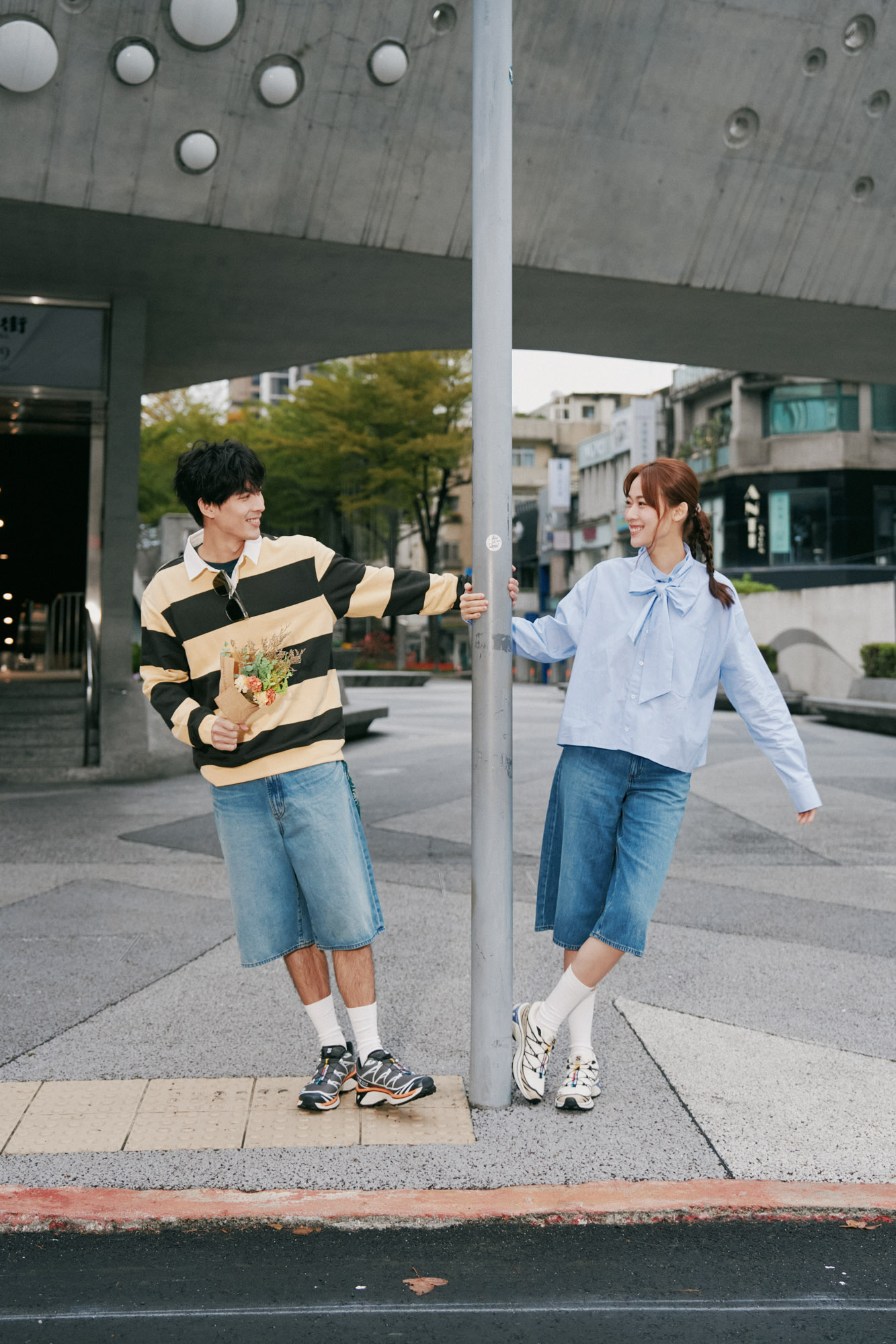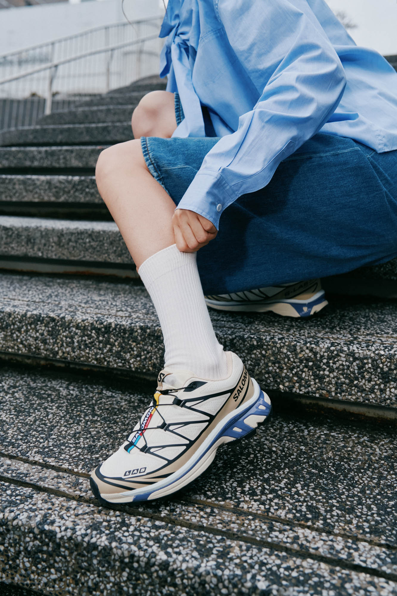 首先是「同材質」的呼應: 男孩女孩不妨都換上這兩年必備的丹寧五分褲(Jorts)作為主軸,並有默契地穿上白襪。女孩上半身搭配蝴蝶結襯衫,保留獨有的甜美感;男生則穿上條紋 Polo 衫,展現俐落氣息。同樣的丹寧元素、白襪與 Salomon XT-6,就是你們之間最簡單的通關密語。