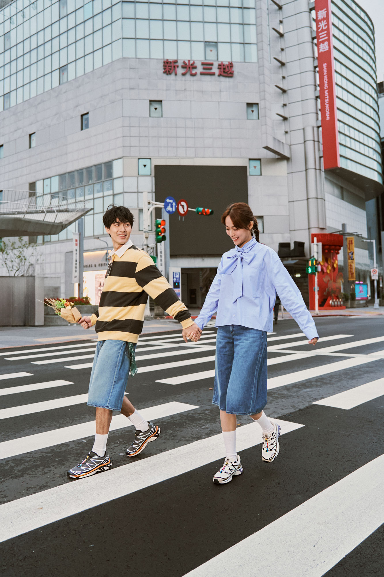 首先是「同材質」的呼應: 男孩女孩不妨都換上這兩年必備的丹寧五分褲(Jorts)作為主軸,並有默契地穿上白襪。女孩上半身搭配蝴蝶結襯衫,保留獨有的甜美感;男生則穿上條紋 Polo 衫,展現俐落氣息。同樣的丹寧元素、白襪與 Salomon XT-6,就是你們之間最簡單的通關密語。