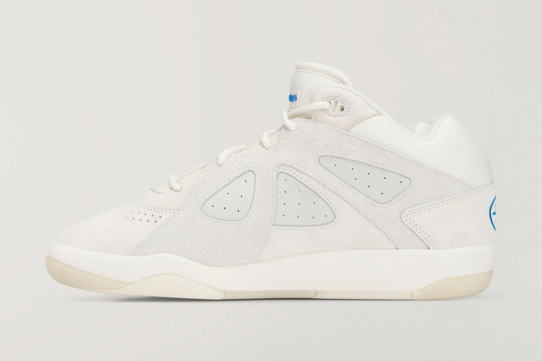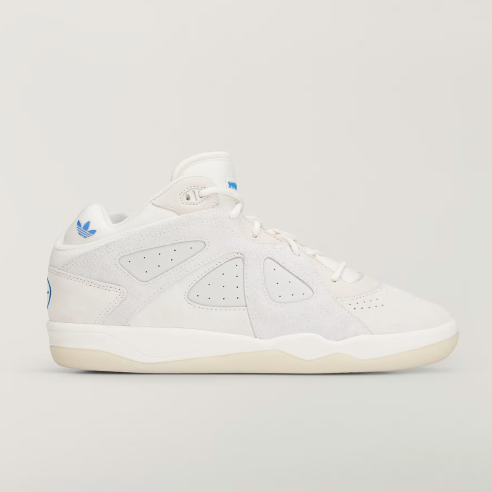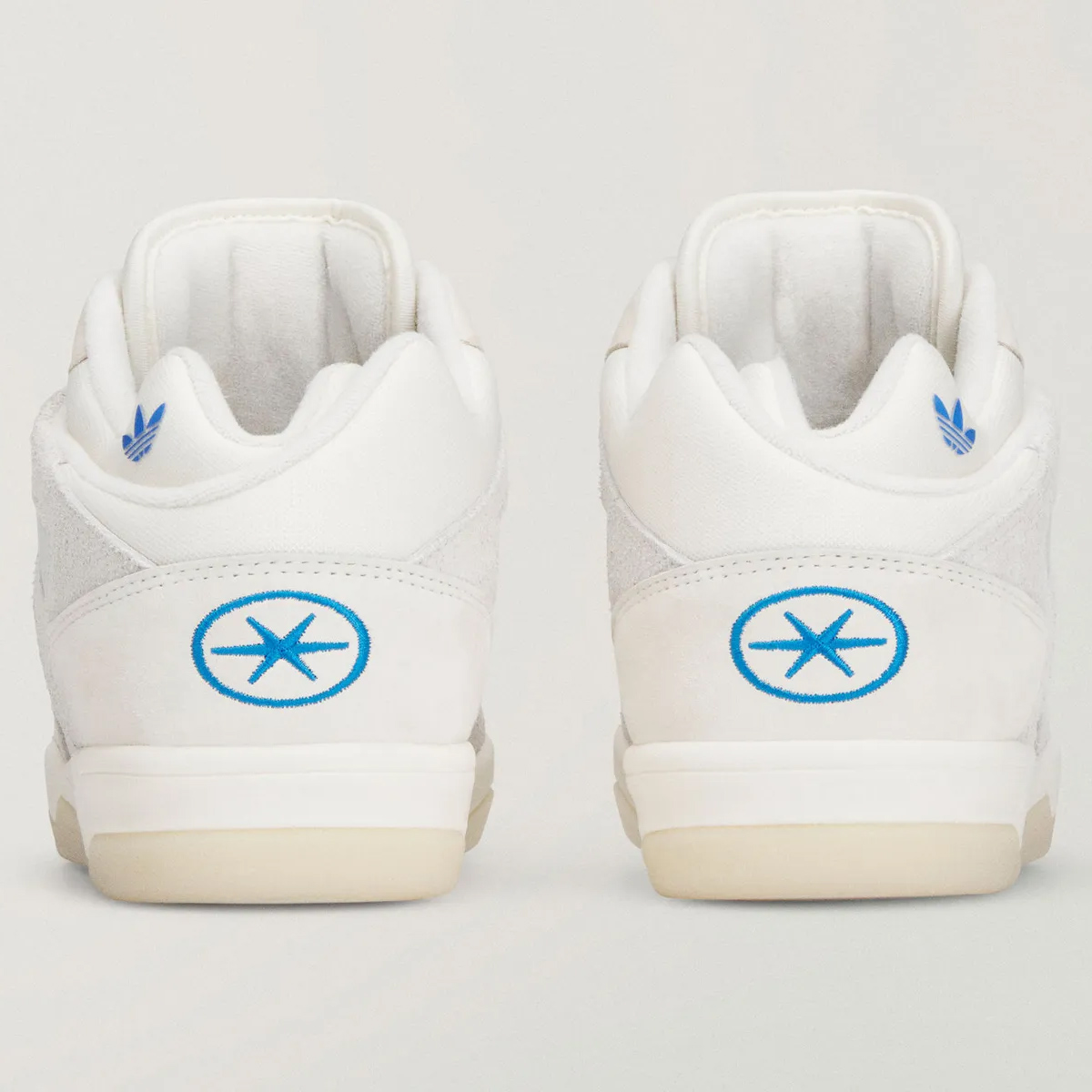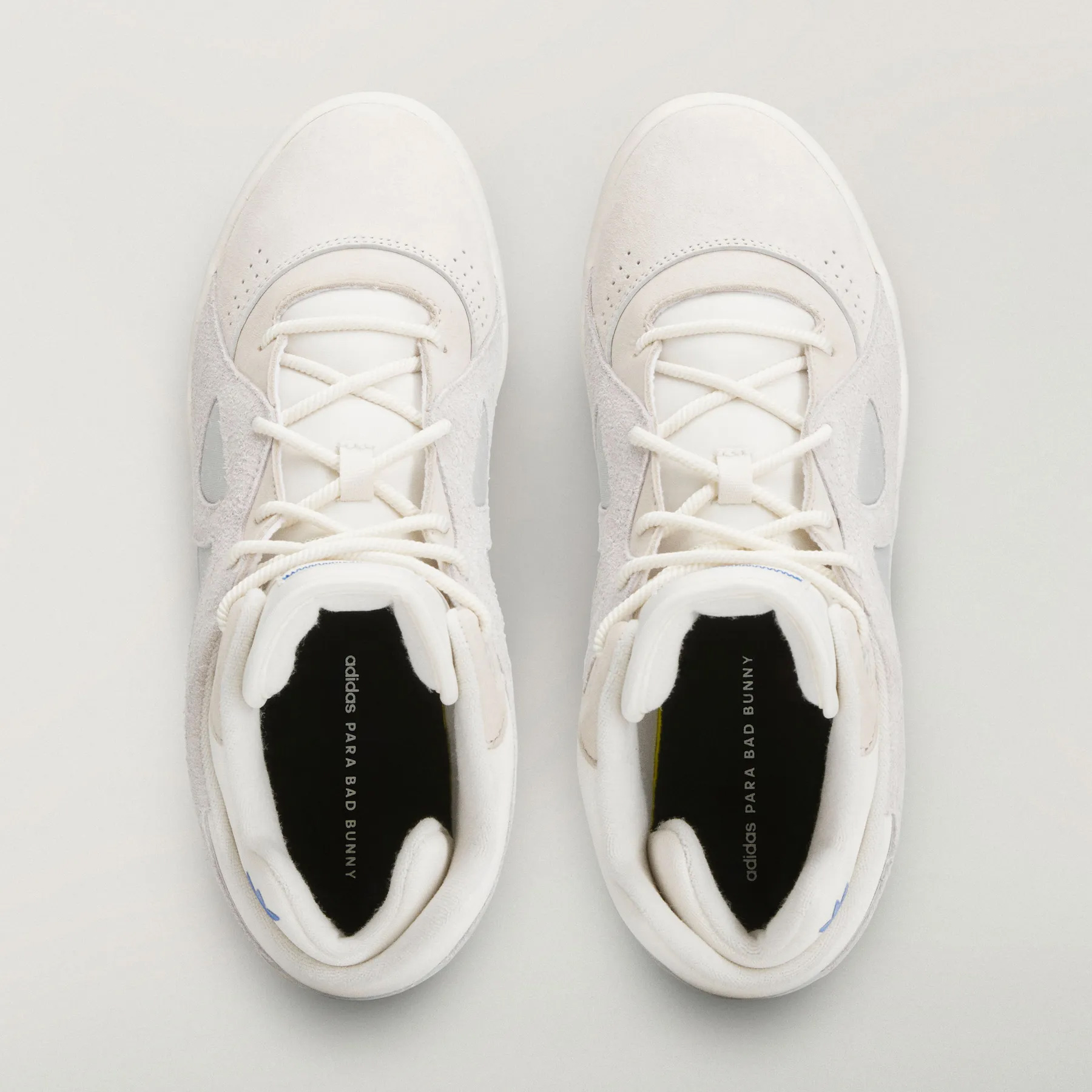 這雙白色的 BadBo 1.0,以一顆星形標誌作為 Bad Bunny 的專屬標識,致敬波多黎各國旗,鞋領內側裝飾有藍色三葉草標誌,鞋舌上保留了標誌性的縫線圖案,黑色鞋墊上印有「Adidas para Bad Bunny」字樣。