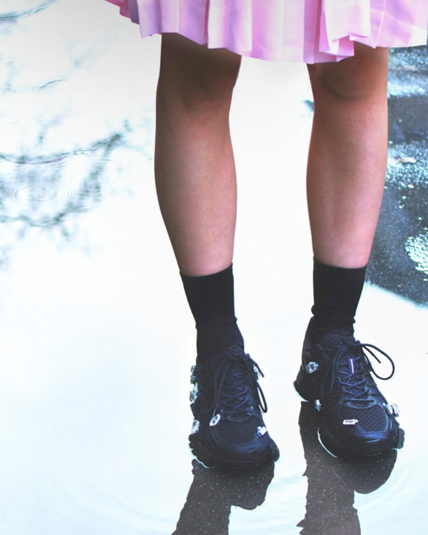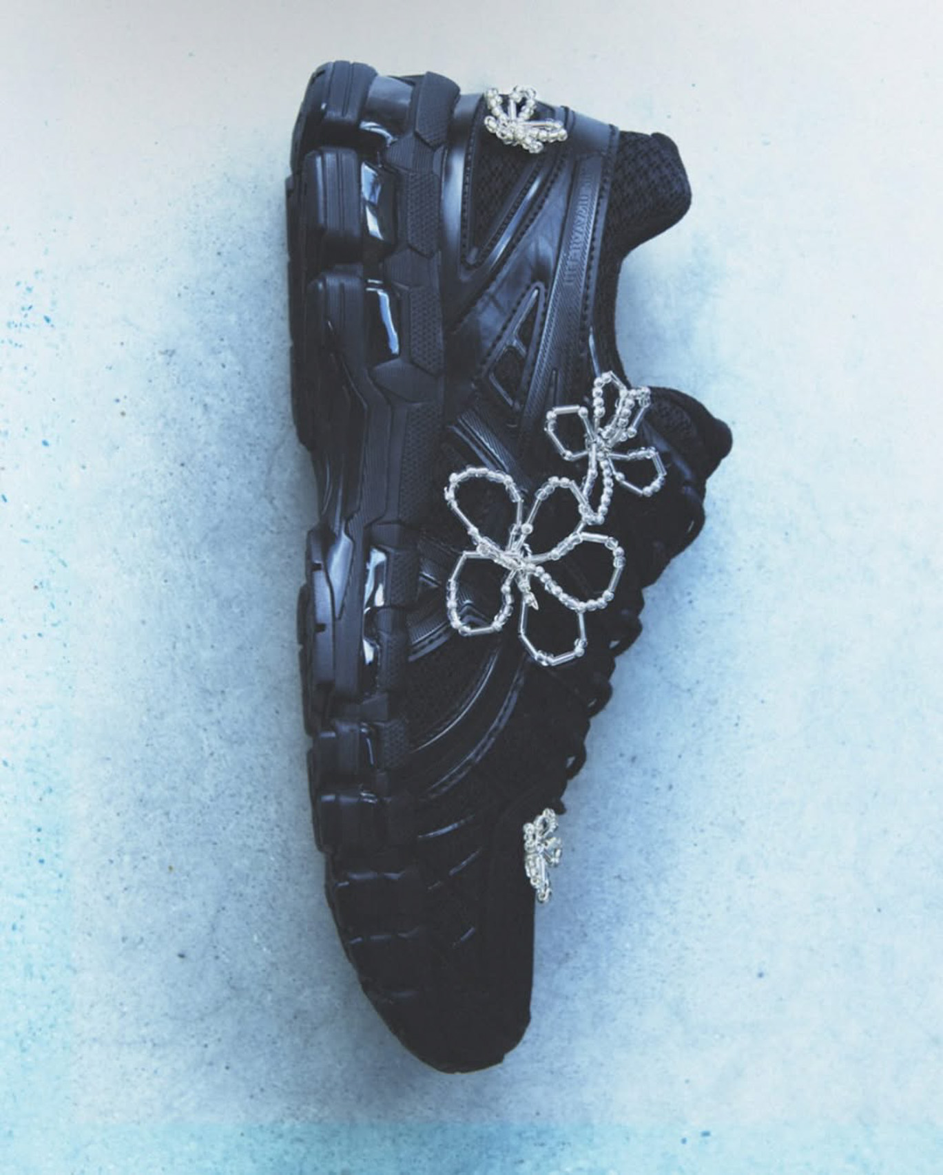 在純黑、純白為基調下,保留傳統機能網布拼接皮革的外觀,但在鞋面上放上錯落有致的珍珠光澤蝴蝶結、與手工製作的 錯配寶石,以及充滿流動感的花卉元素,而左腳和右腳的裝飾並非完全鏡像,用「不對稱美學」設計,讓鞋履充滿了流動感與生命力。