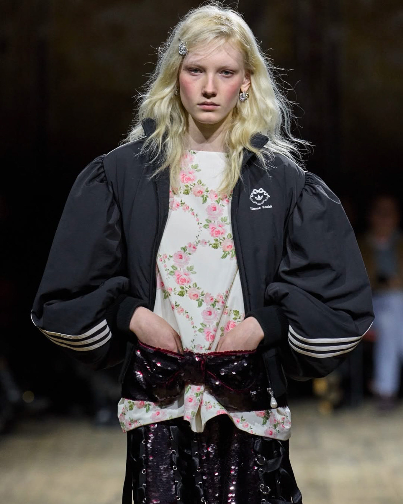 從秀場曝光的造型可以看到,經典的 adidas 運動外套被解構,放入了薄紗與立體澎袖的語境,原本在操場上奔跑的運動短褲、長褲,換上了極具光澤感的材質與荷葉邊,而熟悉的「三條紋」上衣,則點綴了柔和的粉色系與細膩抓褶的荷葉邊,完美保留了 adidas 的運動血統與自身的華麗少女心。