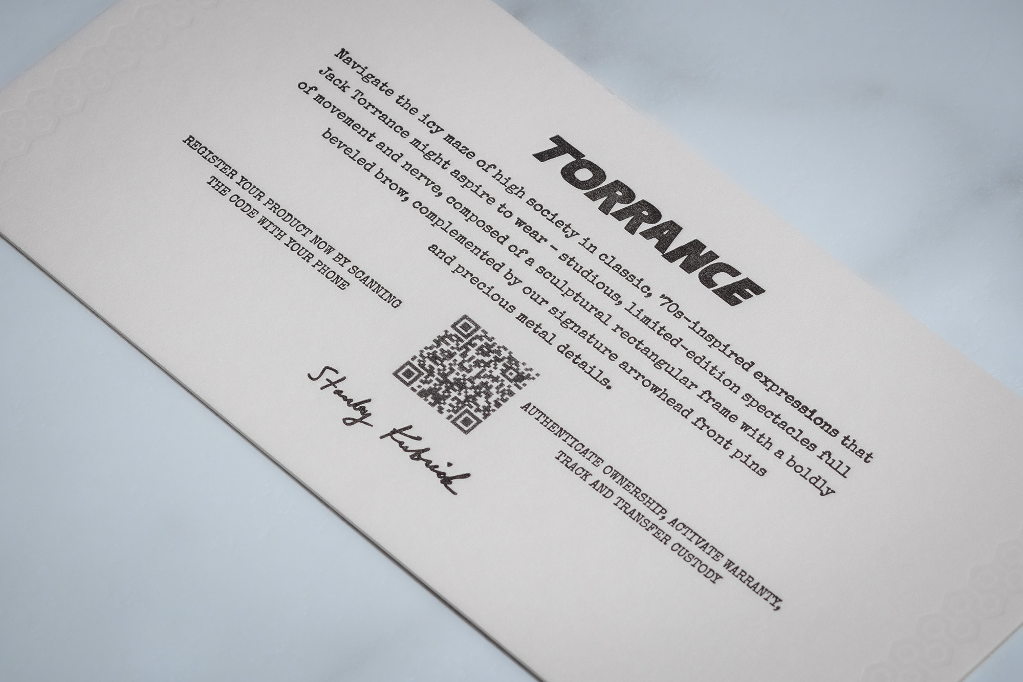 鏡框於日本手工製造,高品質板料並裝飾品牌標誌性貴金屬細節,每副眼鏡皆置於書冊式珍藏盒中,附活版印刷限量認證卡、庫柏力克簽名壓印眼鏡盒、不鏽鋼螺絲起子、迷你書冊與紀念拭鏡布等配件,將一副眼鏡轉化為完整敘事。
